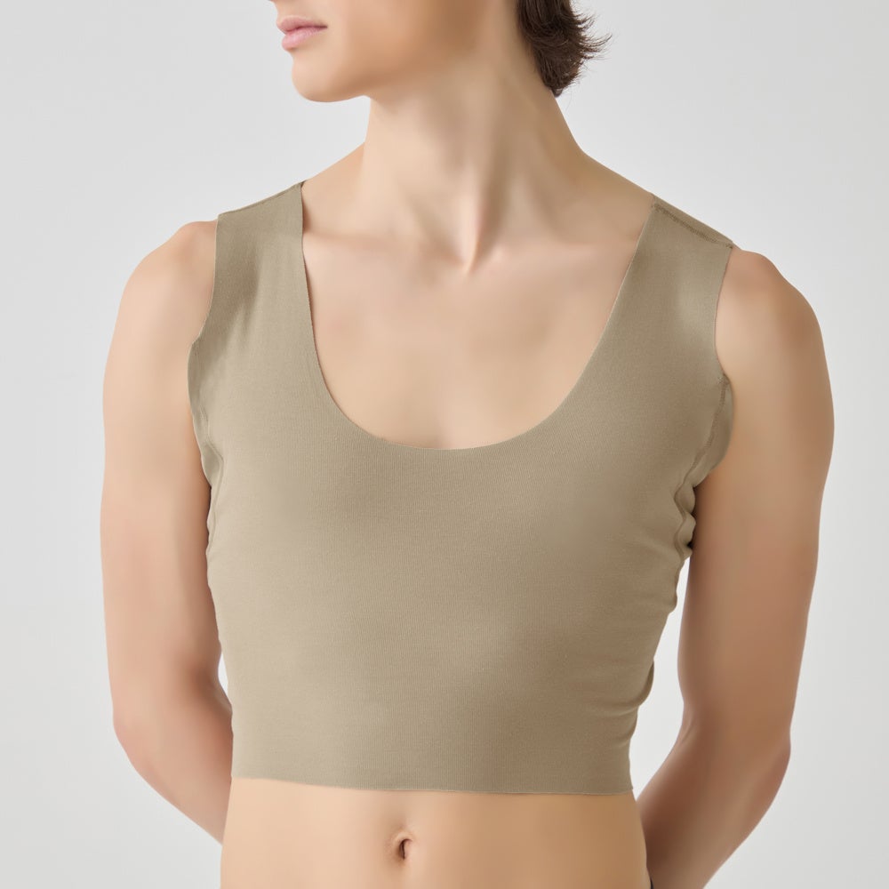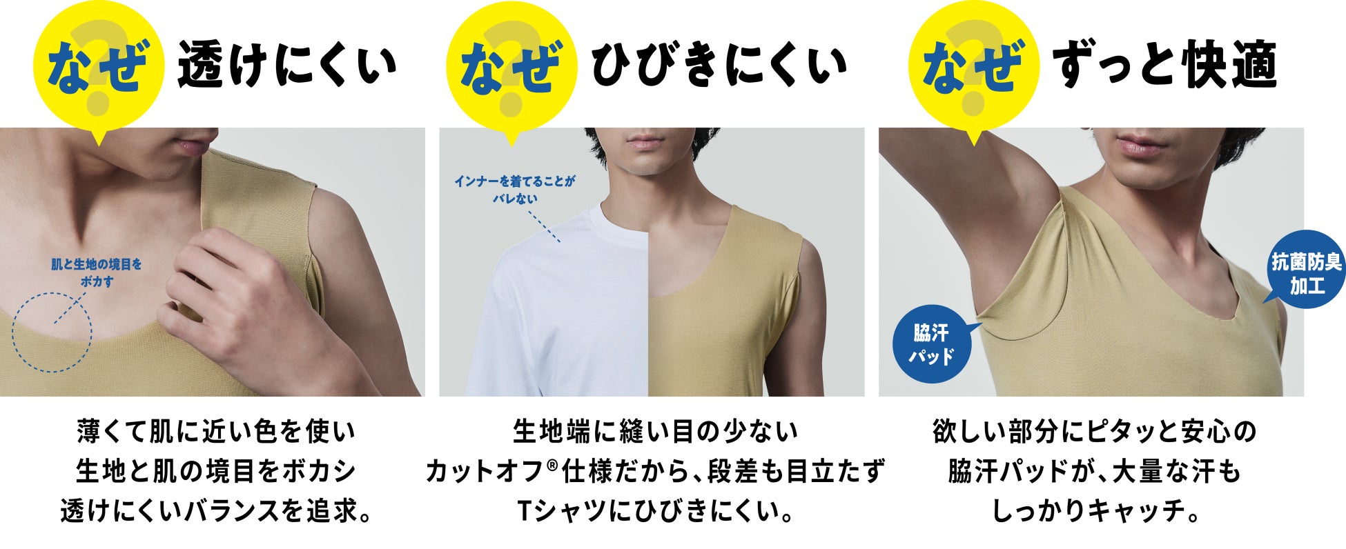 「エチケット対策はしたいが、もう1枚着ることによる暑さへの懸念」というニーズに応えるため、見た目にも涼しそうで、体感できることを追求し、Tシャツ着用時に最も風が通りやすいウエスト周りの生地をカット。従来品と比べて約半分の生地量で、圧倒的に涼しさを体感できるニュータイプのインナーウェアを開発しました。また、従来品より伸縮性の高い素材を使用し、体の形状にフィットする設計調整で、着丈を短くしてもずり上がりにくい着用感を 実現。汗取りパッドも猛暑対策として大型タイプを採用しました。