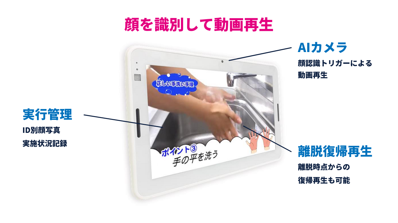 顔認証エンジンが実装されていることから、出勤時は長めの丁寧な手洗いビデオの再生、その後は短めの動画に自動的に切り替えることのできる機能を搭載、他方、同一手洗い者の手洗い実施状況の記録/集計も可能となっており、管理責任者の監督負担も大幅に軽減されます。先行モデルの導入現場の声を反映し、衛生キャップ、マスク着用下でも顔を識別して機能します。