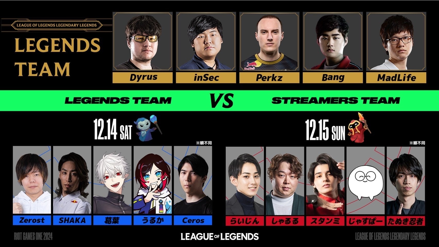 LoLの歴史に名を刻む世界の著名プレイヤーを招待し、特別なショーマッチをBo1形式で両日2試合ずつ開催!第1戦目は、ストリーマーチームがLegendsチームに挑戦します。第2戦目のLegendsチームの対戦相手については後日お知らせします。