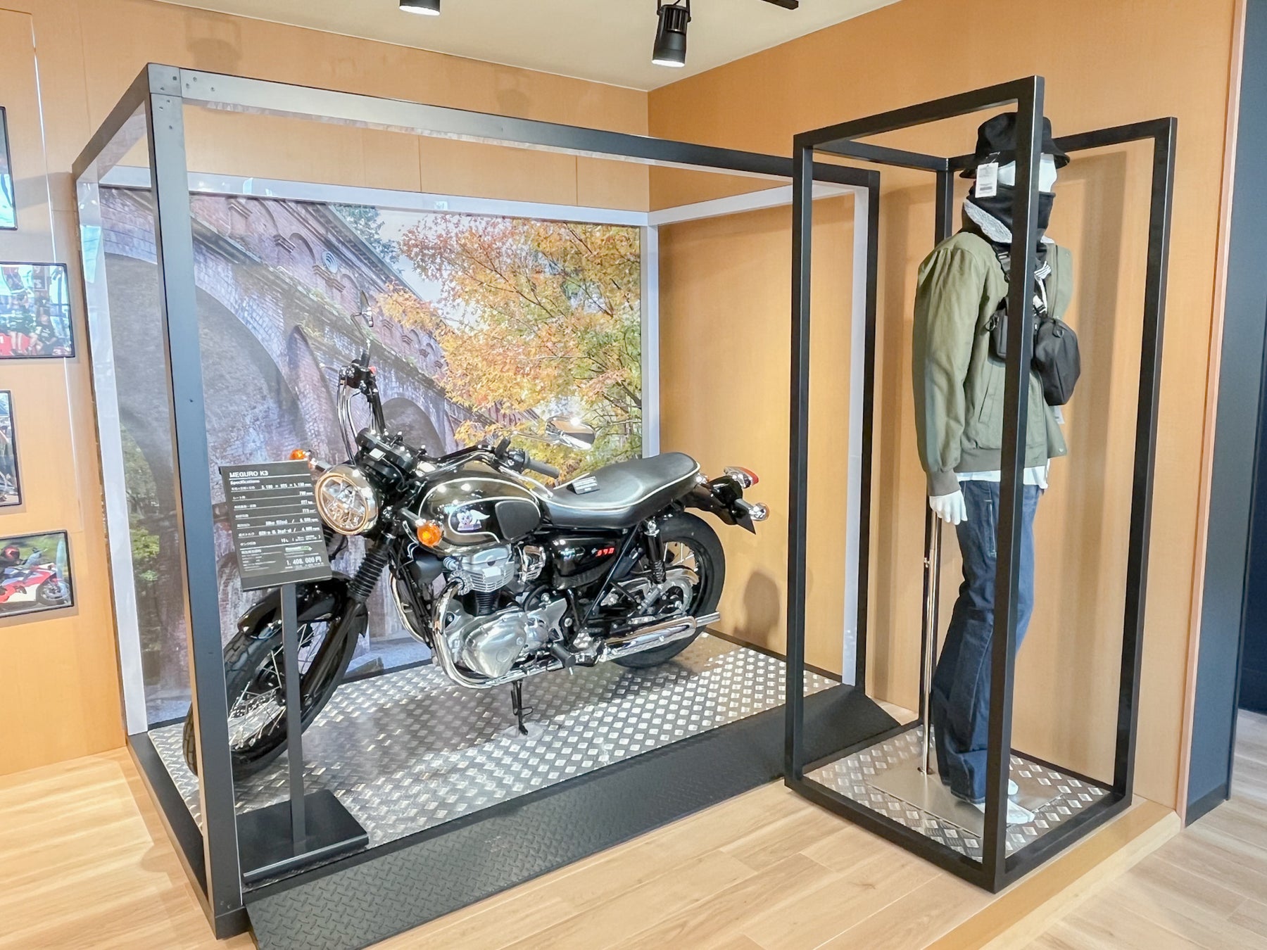木目調のフロアと白い天井が織りなす明るい店内。モーターサイクルとプラザアパレルがゆったりと展示され、どなたでも楽しめる空間としています。