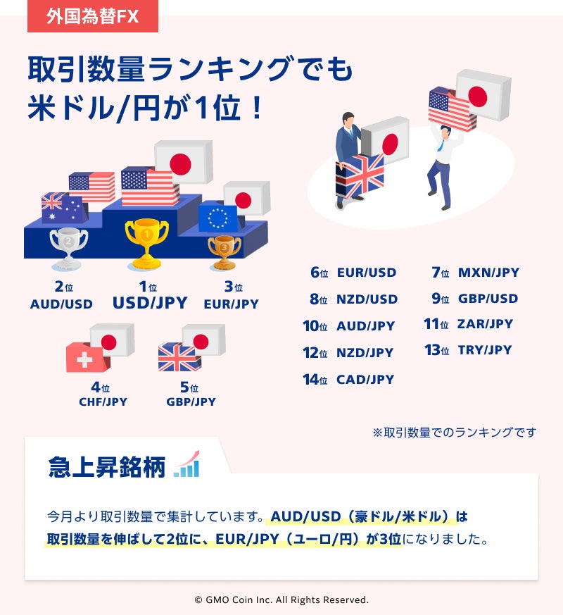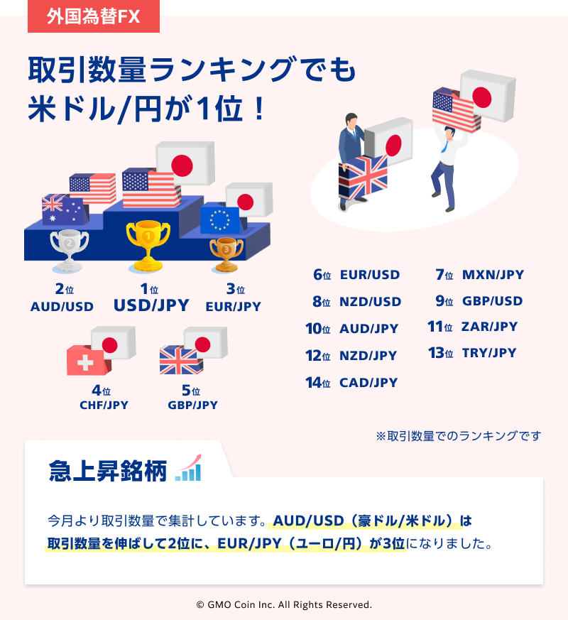 「外国為替FX」は、今月より取引数量で集計しています。USD/JPY(米ドル/円)は引き続き1位をキープ。AUD/USD(豪ドル/米ドル)が取引数量を伸ばし2位に、EUR/JPY(ユーロ/円)が3位になりました。