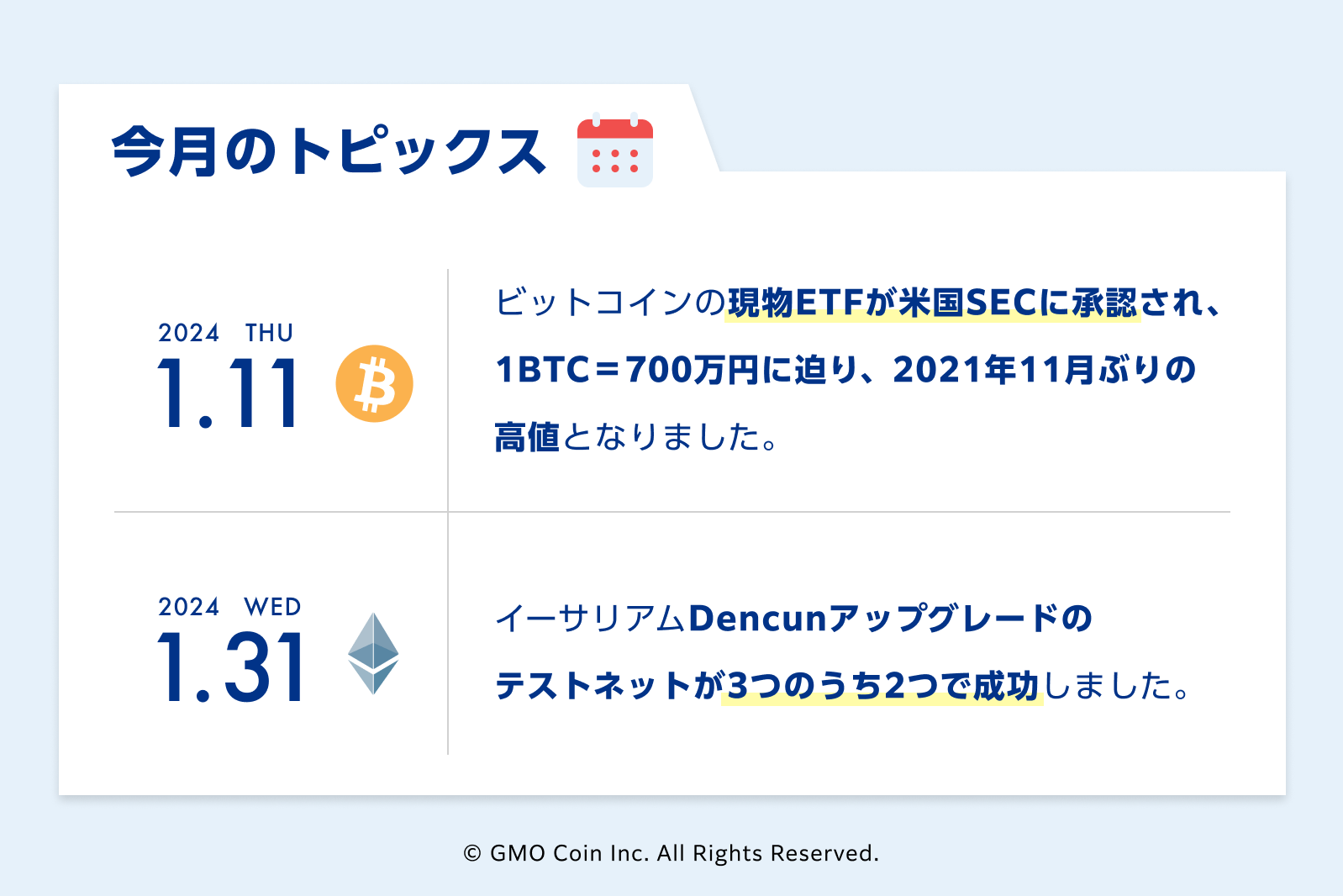 暗号資産全体として、2024年1月は下記のトピックスがありました。