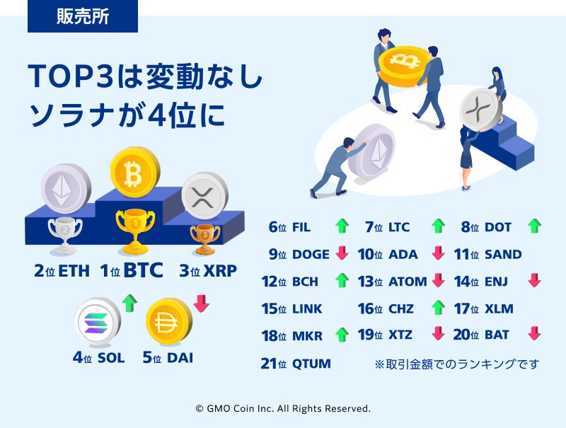 「販売所」では、TOP3銘柄に変動はなく、1位ビットコイン(BTC)、2位イーサリアム(ETH)、3位リップル(XRP)となり、4位にはソラナ(SOL)、5位にダイ(DAI)という結果になりました。