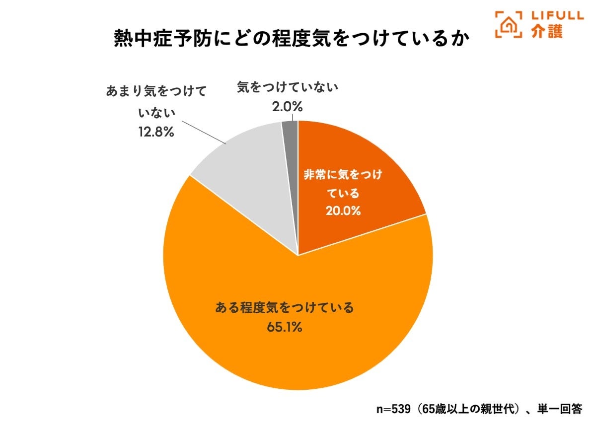 65歳以上の親世代に熱中症にどの程度気をつけているかを尋ねたところ、「非常に気をつけている」(20.0%)、「ある程度気をつけている」(65.1%)を合計して85.1%の方が熱中症予防に気をつけていることがわかりました。