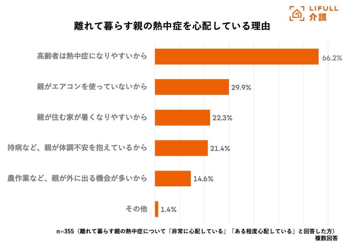 子世代に「親の熱中症を心配する理由」を聞いたところ、最も多かったのは「高齢者は熱中症になりやすいから」(66.2%)でした。高齢になると暑さや喉の渇きを感じる機能や体温調節の機能が衰えるため(※5)、子世代としても親の熱中症のなりやすさを心配していると考えられます。また「親がエアコンを使っていないから」(29.9%)も3割近く回答を集め、第2位となりました。
