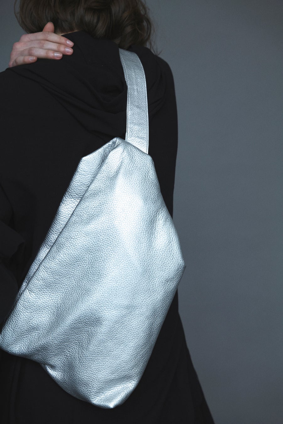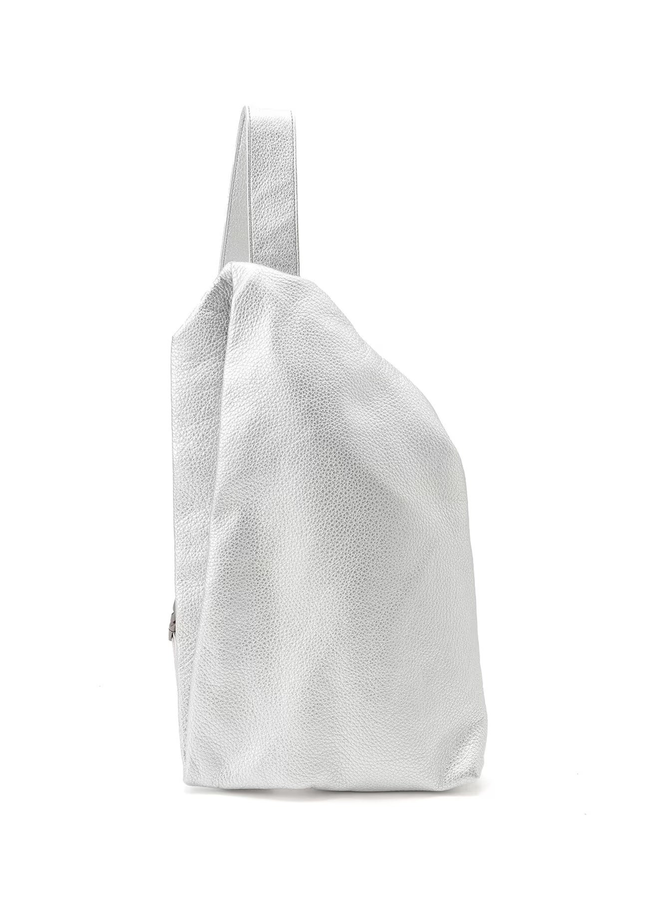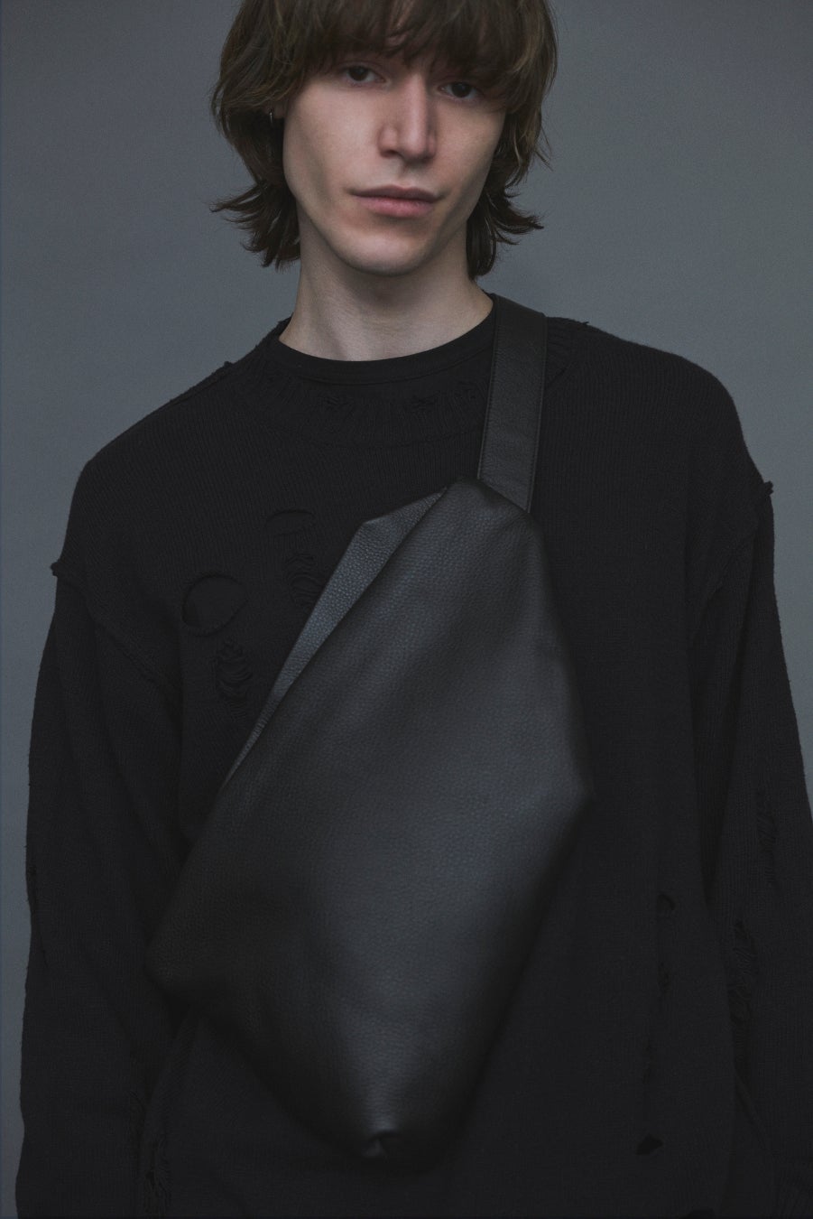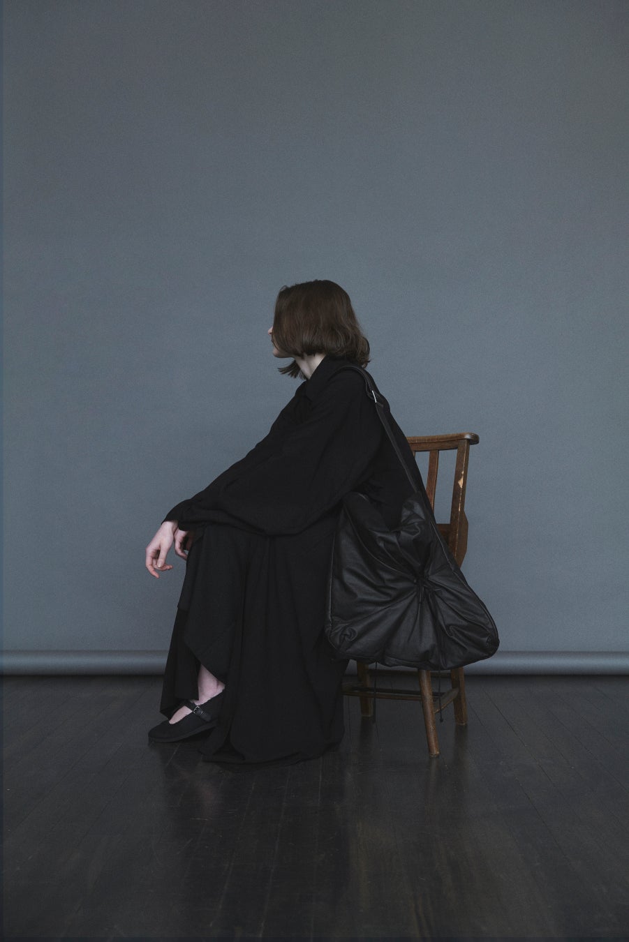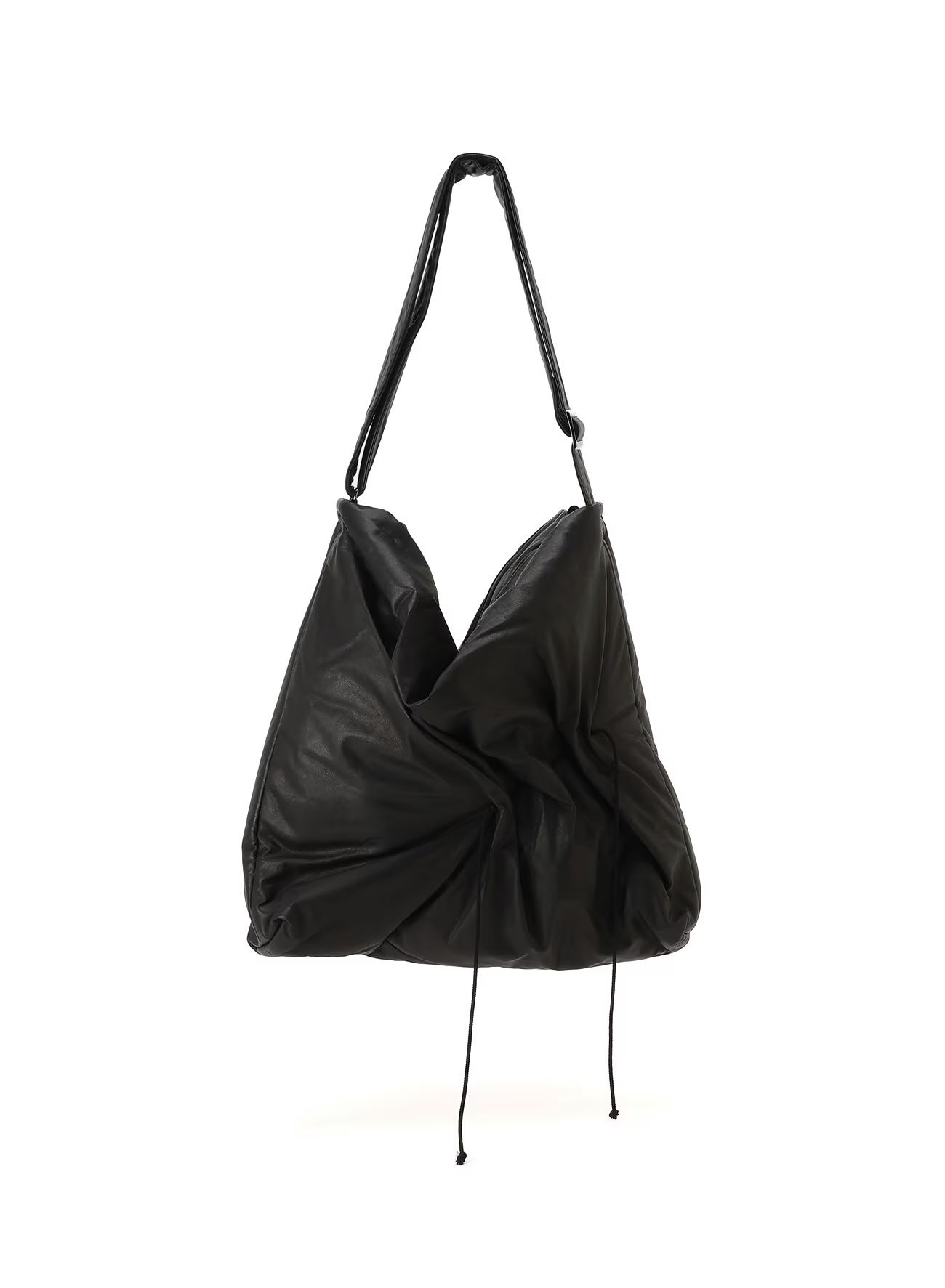 不定形のパデッドショルダー。柔らかなガーメントレザーは服地のようなドレープを生み、スピンドル紐を絞ることでより膨らみが強調され、陰影が印象的でユニークな表情に。十分な収納容量、幅広のストラップがコンテンポラリーな質感と、持った時の安定感を与えます。