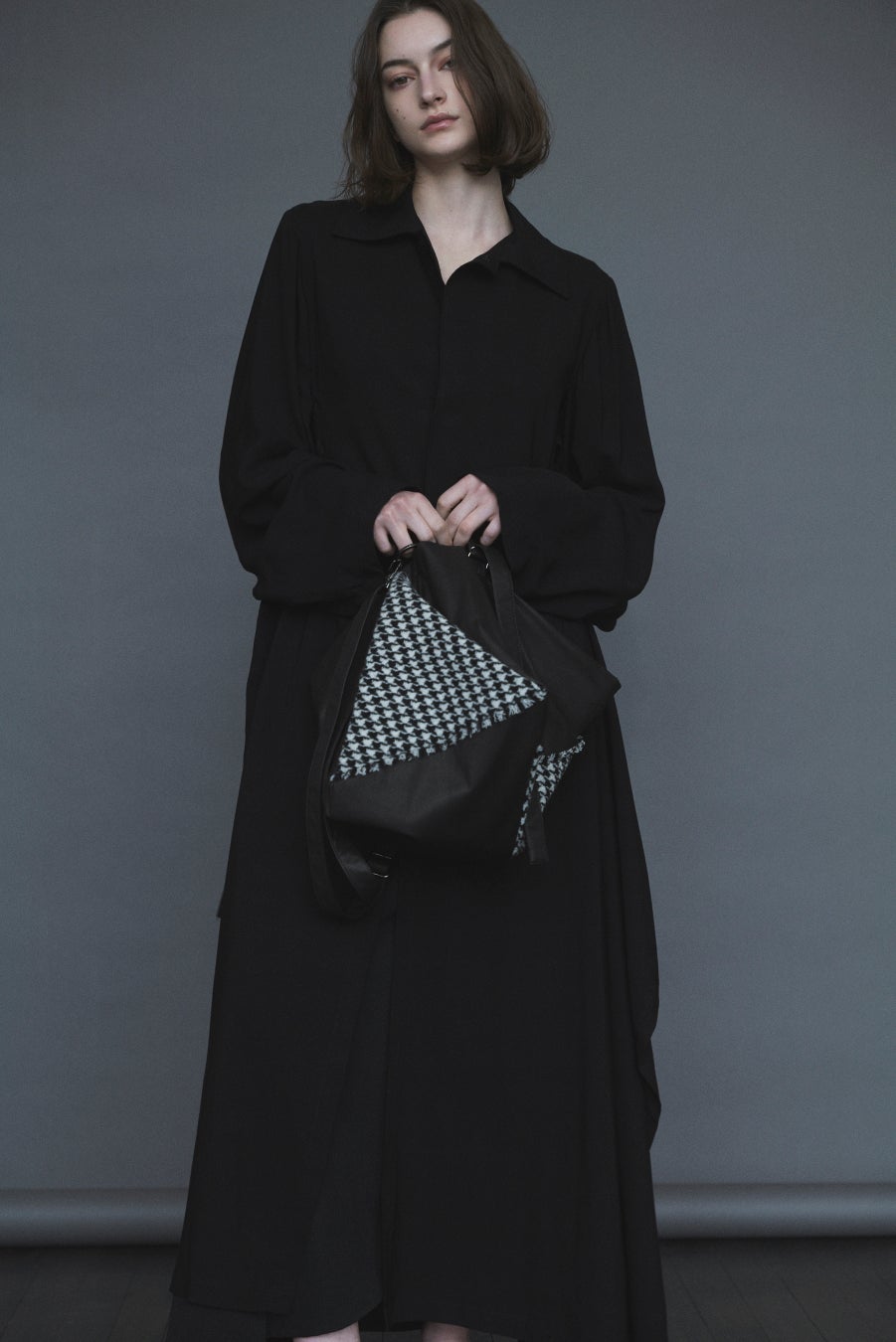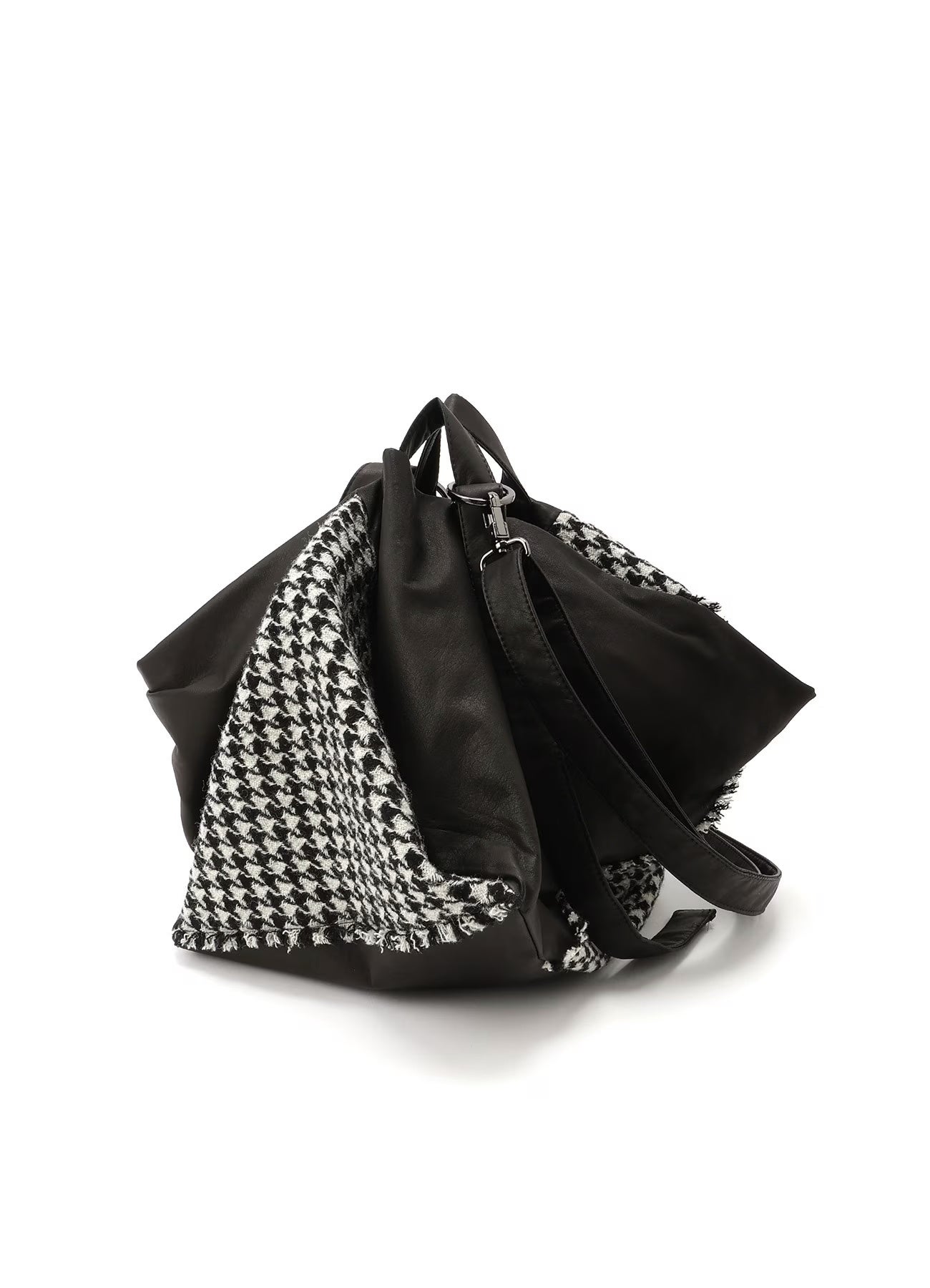 千鳥格子柄が構成された、いつもより一回り小さい「TULIPS」。底のパターン(型)を少し捻ることでハンドルを合わせて持った時に自然なドレープが生まれる造形が花のつぼみを連想させるバック。2種のハンドルの持ち替えと、取り外せるショルダーストラップで3WAY仕様が可能。