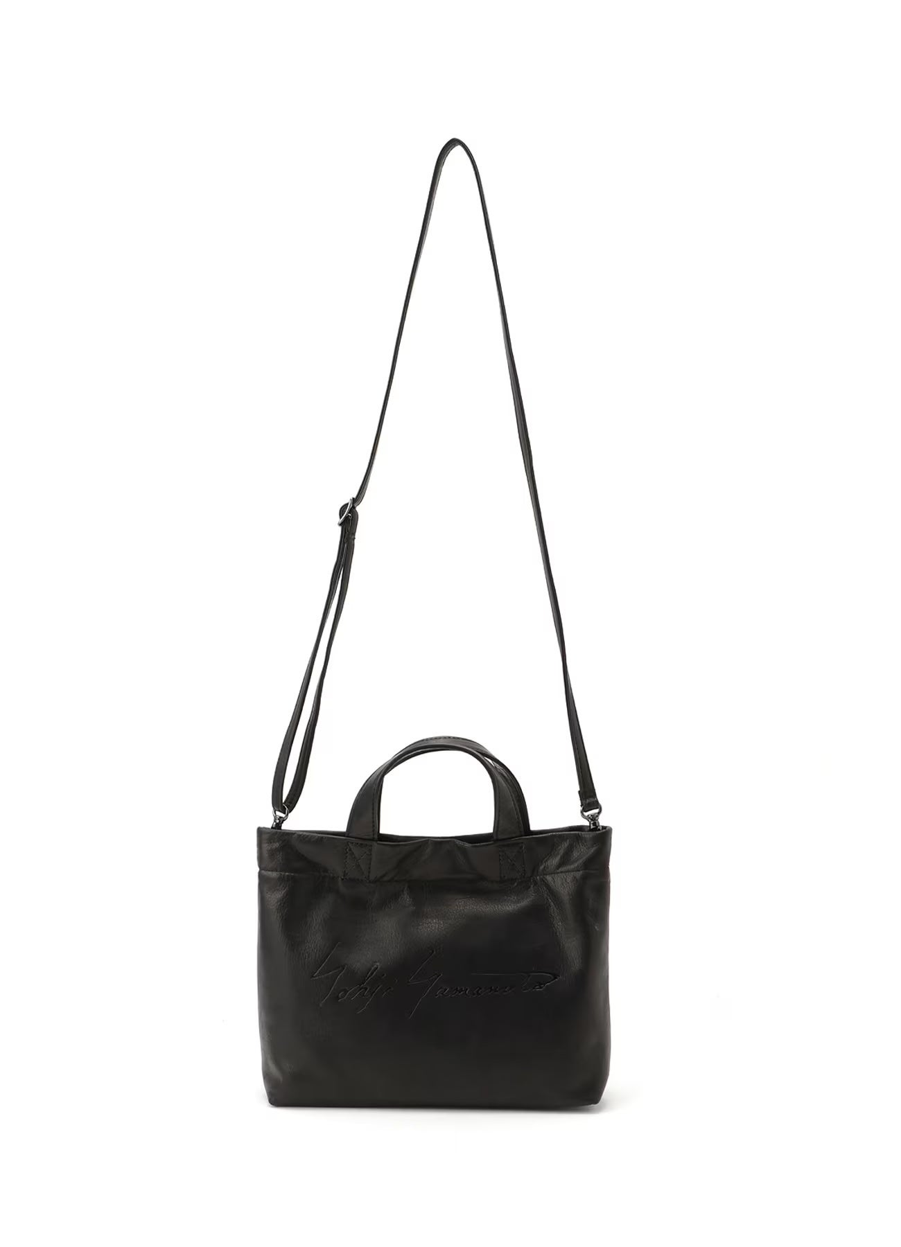 Yohji Yamamotoのシグネチャーが素押しされた、ショルダー付きのミニトートバッグ。