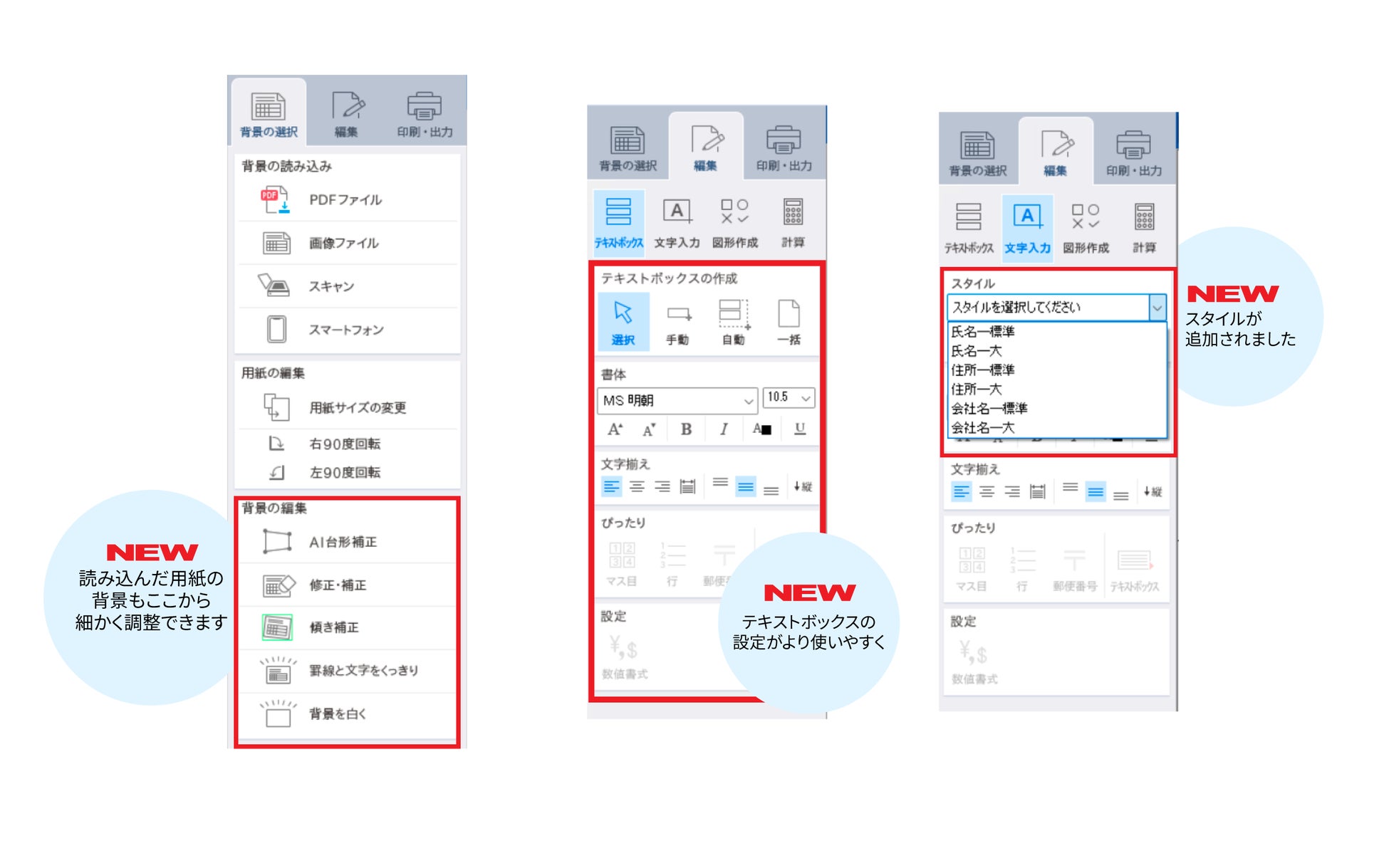 本バージョンでは、操作画面を見直しより素早く書類を作成できたり、テキストボックスの一括作成の精度を向上、文字のスタイルを設定、登録など、さらに快適に作業できるようになりました。