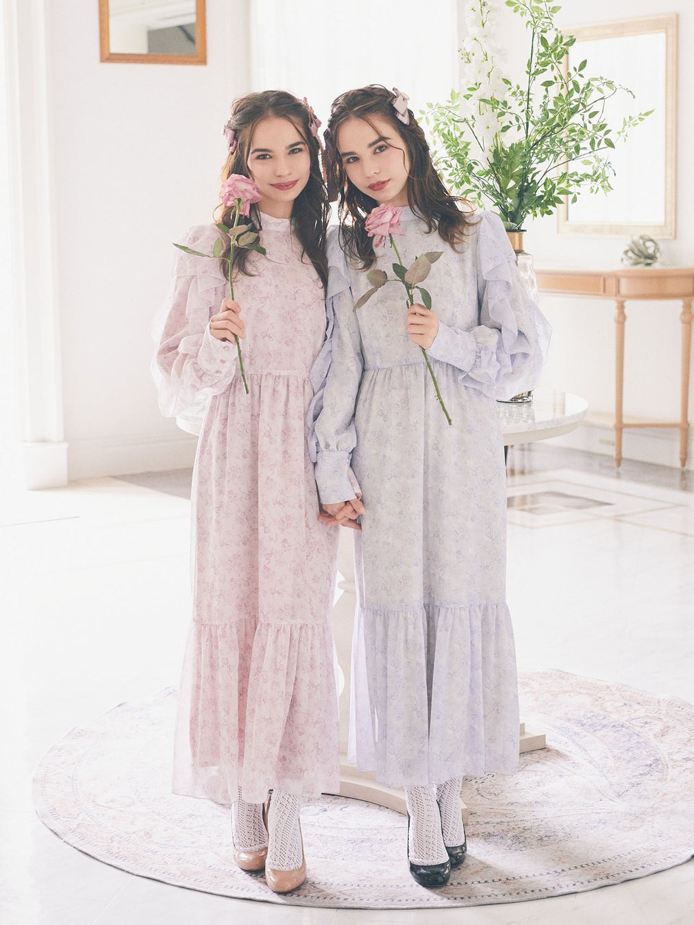 雑貨でも使用しているフラワー×リボンのオリジナル柄をプリントしたシフォン生地のふんわり優しいワンピース。