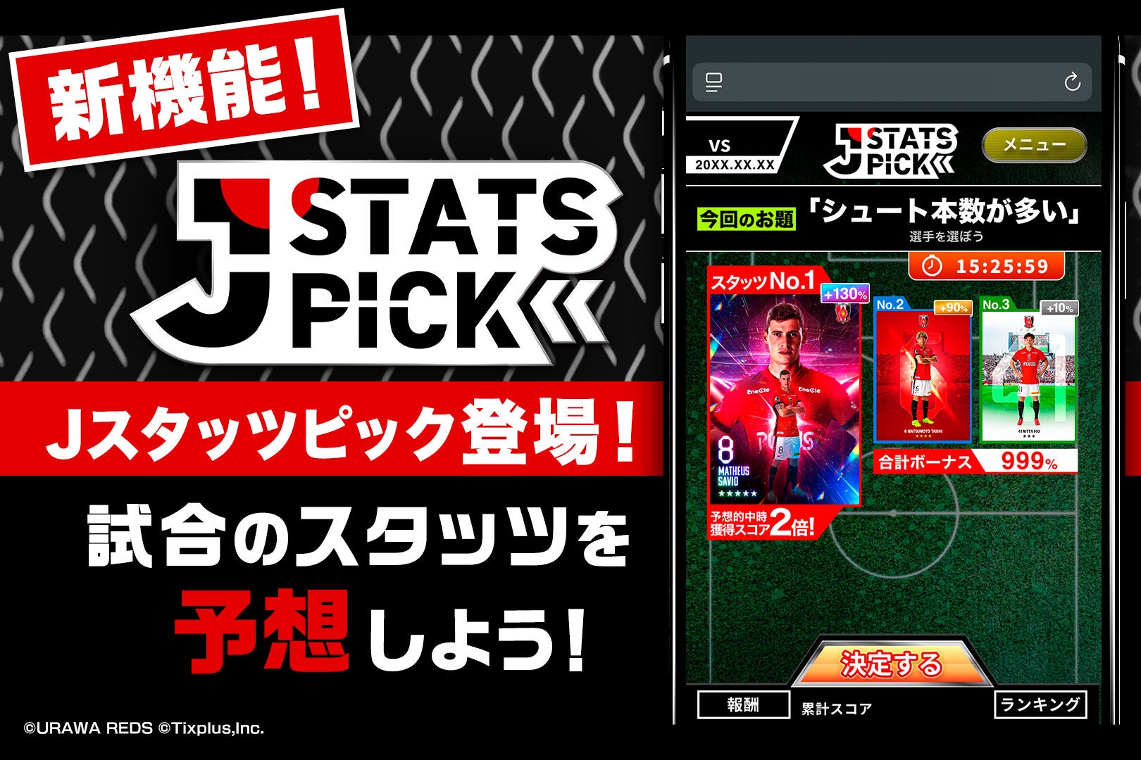 プロスポーツチームやリーグ向けのデジタルトレーディングカードサービスを開発、運営している株式会社Tixplus(本社:東京都渋谷区、代表取締役:池田 宗多朗、以下Tixplus)は、浦和レッドダイヤモンズ株式会社と共同で提供している公式デジタルカードコレクションサービス「浦和レッズコレクション」において、2025年2月28日(金)からβ版としてサービスを提供していた新機能、「JSTATS PICK」の正式版を2025年4月11日(金)より運用開始いたしました。