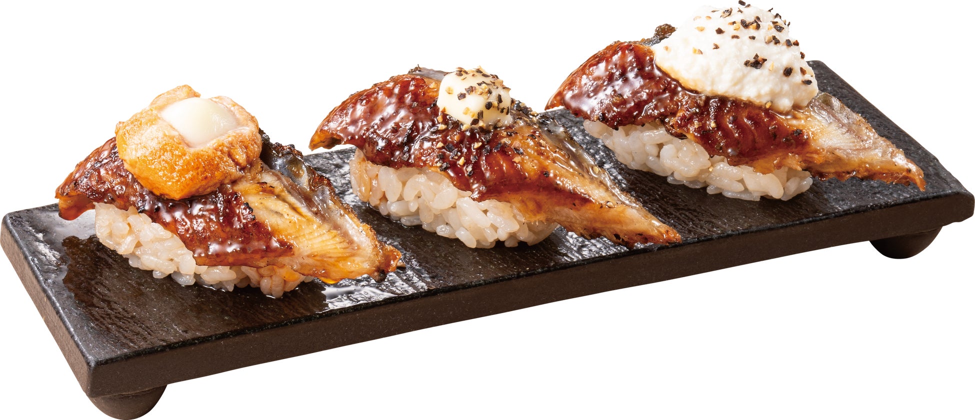 昨年お客さまよりご好評いただいた、うなぎフェアを今年も開催いたします。今回の目玉商品は、「鰻の押し寿司と出汁巻き玉子の包み」です。しっかりと焼き・蒸しの作業を行い、ふっくらと仕上げ、特製のたれをつけるこだわりの詰まったうなぎと相性抜群の出汁巻き玉子を合わせた“押し寿司”の登場です。うなぎと玉子の最強タッグだからこそ老若男女問わずお楽しみいただけます。また、「極み うなぎ3貫」は、うなぎに3種のアレンジを加えました。うなぎの上にあん肝とバターをのせて炙った1貫、炙ったバターに黒胡椒をかけた1貫、豆腐にパルメザンチーズやマヨソースなどを合わせた豆腐クリームをかけた1貫の3種類を食べ比べできる贅沢な一皿です。他にも「う巻き」は、うなぎの蒲焼きを玉子で包み、店内で丁寧に焼きあげ、甘だれと一味唐辛子をかけた逸品です。昨年も販売し、お客さまからご好評をいただいた「うなとろ握り」は、ふっくらとしたうなぎの上に、“とろろマヨ”をかけた寿司です。その他、甘だれを塗って炙り、一味唐辛子をかけた「うなぎの肝串」や、ぽん酢とごま油、チャンジャだれでピリ辛に仕上げた「食べたら虜になる、うなぎのピリ辛まぜそば」などお酒に合う商品もご用意しております。