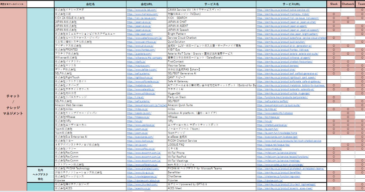 資料請求いただいた方には、カオスマップに加え、「ビジネスツール連携AIサービス提供企業リスト(Excel)」を無償でご提供いたします。このリストは、製品名や製品URLに加え、以下の主要ツールとの連携対応状況をチェック形式で記載しています。
