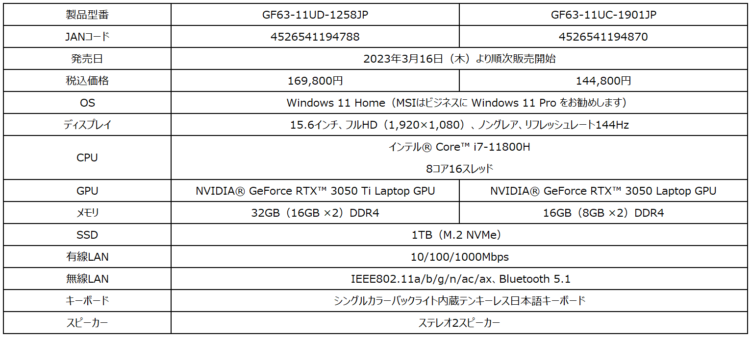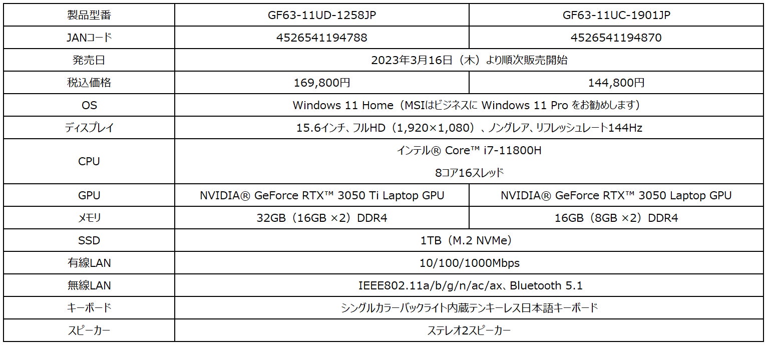 これからPCゲームを始めたいゲーマー向けに最適な機能と性能を凝縮!MSIストア限定モデル「GF63-11UD-1258JP」「GF63-11UC-1901JP」2023年3月16日(木)より発売