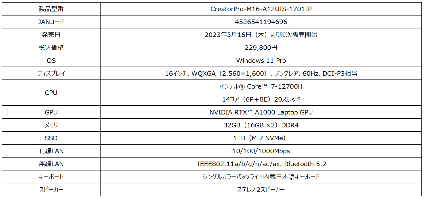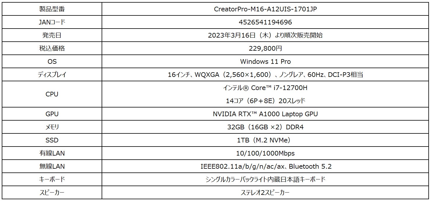 【CreatorPro-M16-A12UIS-1701JPの主な特徴】