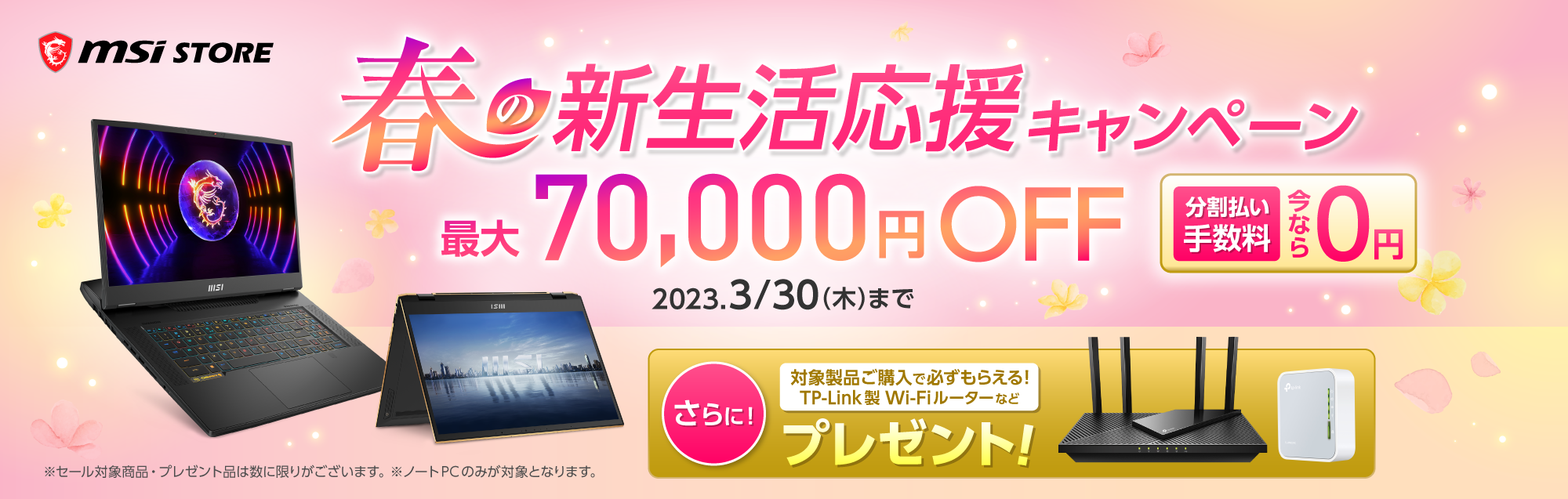 『MSIストア春の新生活応援キャンペーン』では、最新モデルを含む対象ノートPCが通常販売価格より最大70,000円OFFになるセールに加え、対象ノートPCをご購入いただいた方に先着順でTP-Link製Wi-Fiルーターなどをプレゼントいたします。さらに、ショッピングクレジットによる分割払いにて合計30,000円(税込)以上の商品をご購入で、最大60回払いまでの分割金利・手数料が無料になる「分割払い手数料無料キャンペーン」も同時開催中です。