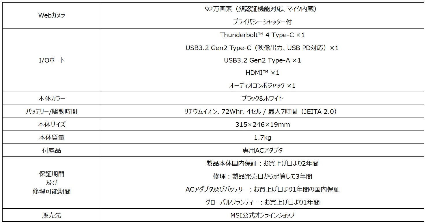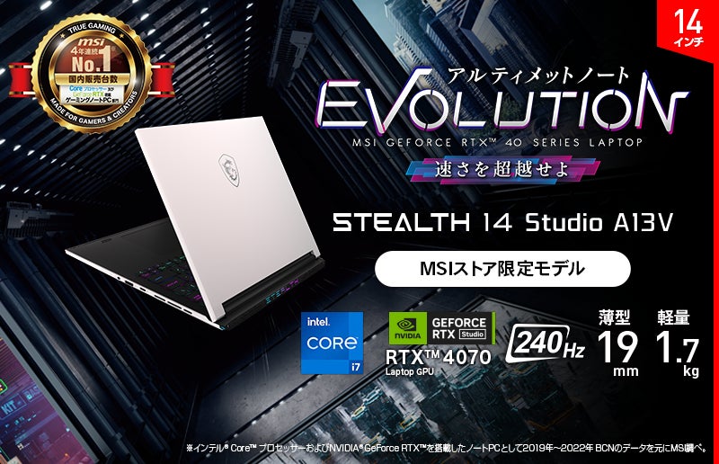 また、マグネシウム合金筐体を採用し、薄さ19mm・軽さ1.7kgの本体に「GeForce RTX™ 40 シリーズ Laptop GPU」と「スーパー滑らか表示ディスプレイ」搭載した14インチゲーミングノートPC「Stealth 14 Studio A13V」シリーズと、プロフェッショナル向けGPUを搭載したモバイルワークステーション「CreatorPro M16 A12U」シリーズのMSIストア限定モデルも同時発売いたします。