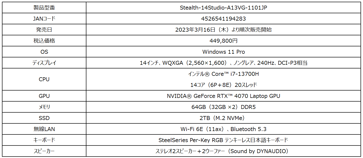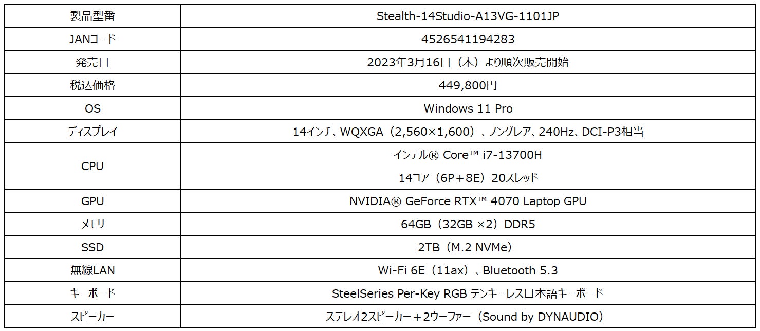 「Stealth 14 Studio A13V」は、薄さ19mm・軽さ1.7kgの14インチタイプの本体に「GeForce RTX™ 4070 Laptop GPU」を搭載した薄型・軽量・ハイエンドゲーミングノートPCです。