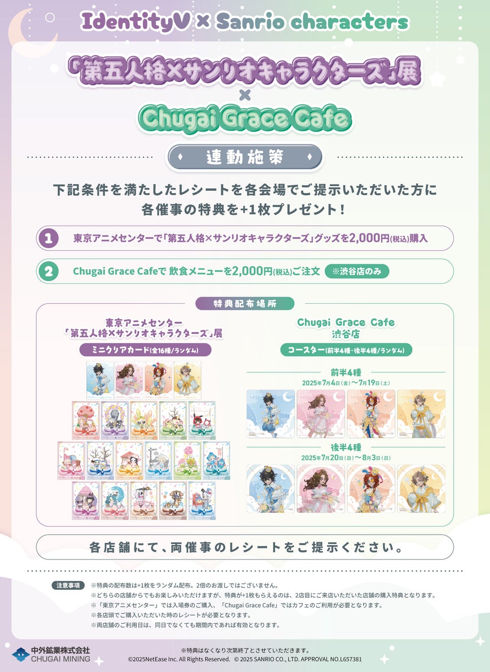期間中、Chugai Grace Cafe【渋谷店】(第五人格×サンリオキャラクターズコラボカフェ)で税込2,000円以上飲食、「第五人格×サンリオキャラクターズ」展にて税込2,000円以上購入のお客様に各催事の特典を1枚プレゼントいたします。