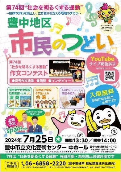 豊中市は、7月の犯罪や非行を防止し、罪を犯した人の更生を市民に広く呼び掛ける“社会を明るくする運動”強調月間に合わせ、駅頭啓発活動、市民のつどい、刑務所作業製品展示即売会を実施します。