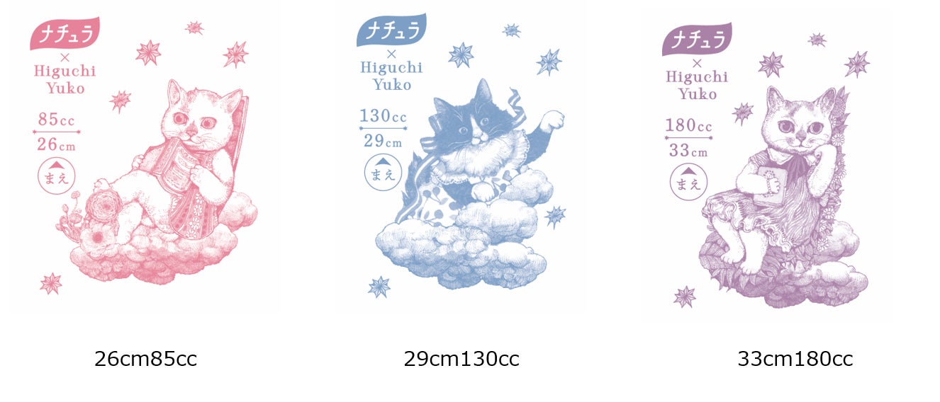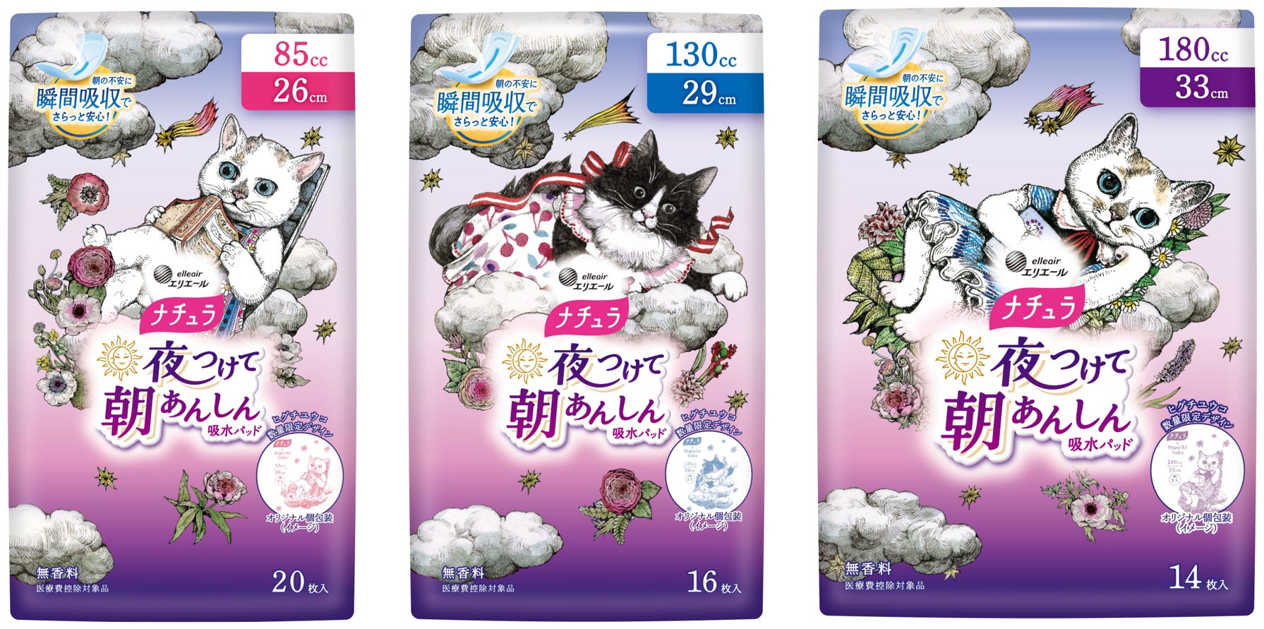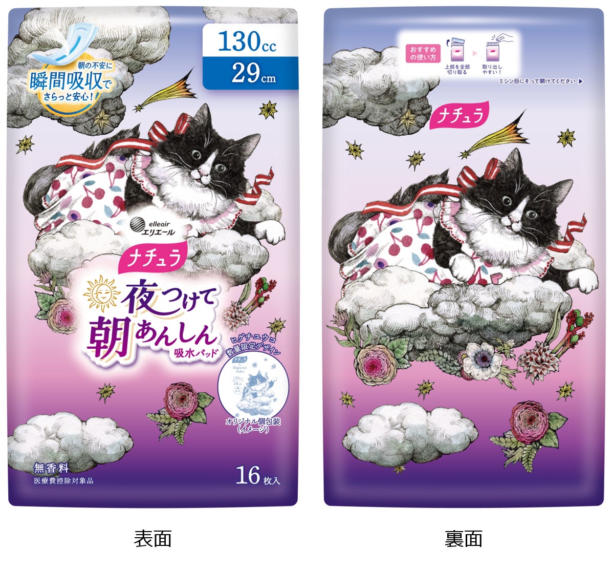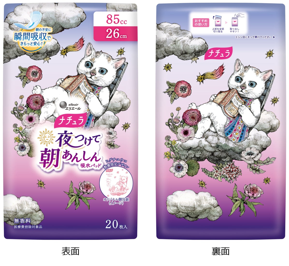 尿モレは女性の4人に1人が悩んでいると言われており、当社が実施した調査※2では、朝に尿モレの不安を抱えている方が70.9%いるものの、夜間に吸水ケア用品を使用している方が半数以下であり、多くの方が尿モレ対策の専用品を未使用である現状が明らかになっています。そこで、今回も手に取りやすいデザインにすることにより、専用品を使用する抵抗感が軽減されるよう、年代を問わずに多くのファンをもつヒグチユウコさんとコラボレーションをします。今回は、夜につけることで、朝の尿モレ対策をする商品「ナチュラ 夜つけて朝あんしん 吸水パッド」にヒグチユウコさんの作品の中でも人気の高いネコのイラストを起用し、全3商品を数量限定で発売します。