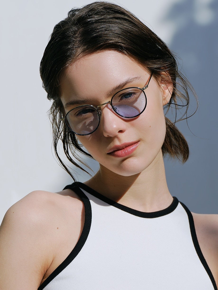 小さめのシェイプに施した優美な彫金とウィンザーリム仕様のコンビネーションフレームが大人の可愛らしさを引き立てる