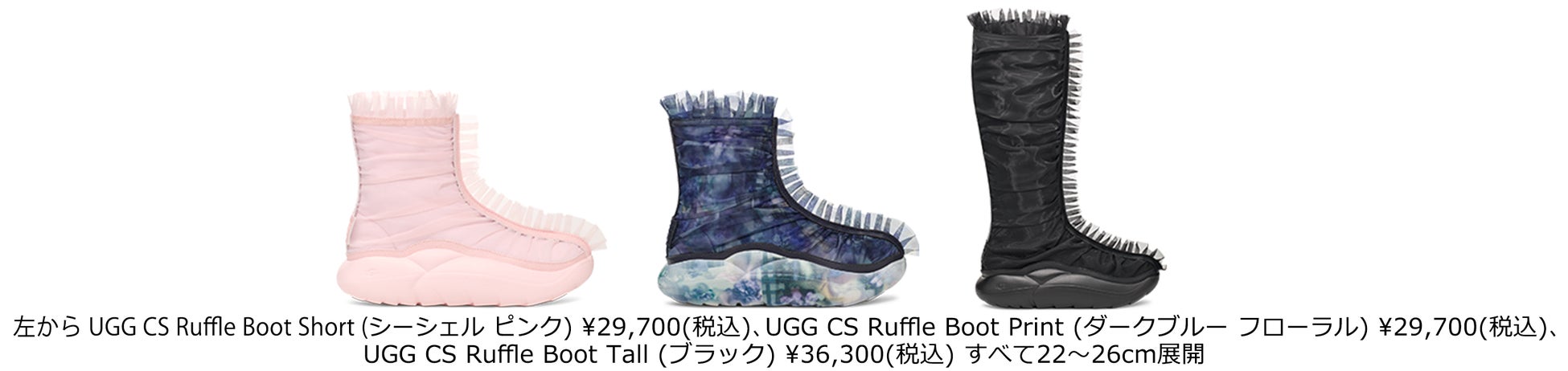 ●UGG CS Ruffle Boot Tall(UGG CS ラッフル ブーツ トール)、UGG CS Ruffle Boot Short(UGG CS ラッフル ブーツ ショート)、UGG CS Ruffle Boot Print(UGG CS ラッフル ブーツ プリント)は、女性らしくにも、タフにも、また、柔らかくも、派手にも、自由に表現できます。Collina Strada とのパートナーシップにより、ヴィーガン素材で作られています。