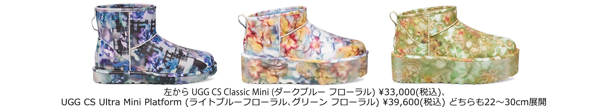 ●UGG CS Ultra Mini Platform(UGG CS ウルトラ ミニ プラットフォーム)とUGG CS Classic Mini(UGG CS クラシック ミニ)は、特注の花柄をUVプリントして、UGGのオリジナルシルエットを再構築しています。ともにフォーファーのライニングで、100%テンセル™(環境に配慮したプロセスで持続可能な木材から作られたソフトで滑らかなリヨセル繊維)と100%リサイクルポリエステルの裏地でつくられています。