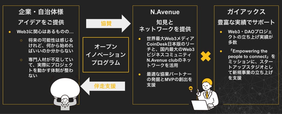 自律分散型組織「DAO」のコンサルティング・実務支援を提供する株式会社ガイアックス(本社:東京都千代田区、代表執行役社長:上田 祐司、証券コード:3775、以下 ガイアックス)は、.Avenue株式会社(本社:東京都港区、代表取締役:神本 侑季、以下「N.Avenue」)と共同で、地方創生領域におけるWeb3活用を支援する「Web3・地方創生オープンイノベーションプログラム」を始動いたします。