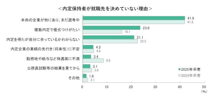 ○「本命企業がまだ選考中」が最多。「複数内定で優劣つけがたい」が前年より大きく増加