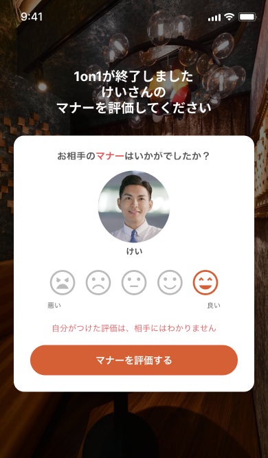 1on1終了後に、相互にマナーを評価するシステムを導入しています。評価の低い方の利用制限をすることで、上質で安心な出会いを提供します。