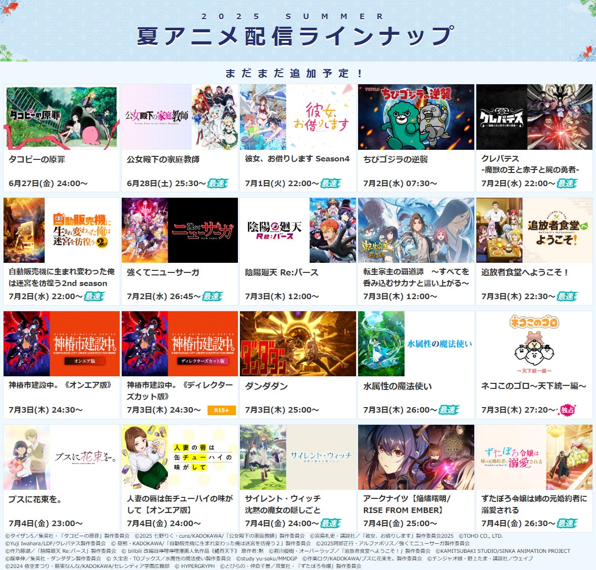 ※詳細は次項目「■2025夏アニメ・配信決定一覧」 及び ラインナップページをご確認ください