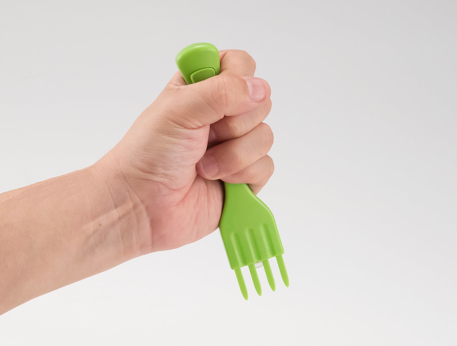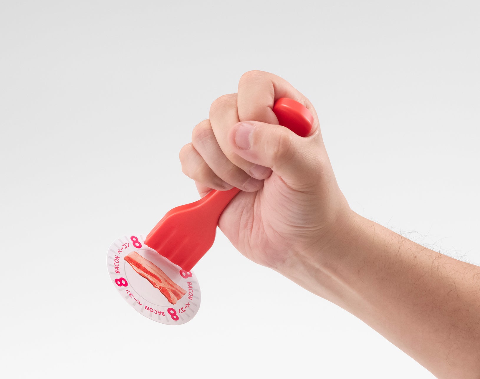 同商品は、付属のフォークがポイントで、フォークの先端部分が押されると櫛状の部分が本体内部に入り、櫛の付け根についている小さい吸盤でフォークに食材カードが付く形状です。机に置いたカードにフォークを突き刺すとカードがとれる仕組みです。