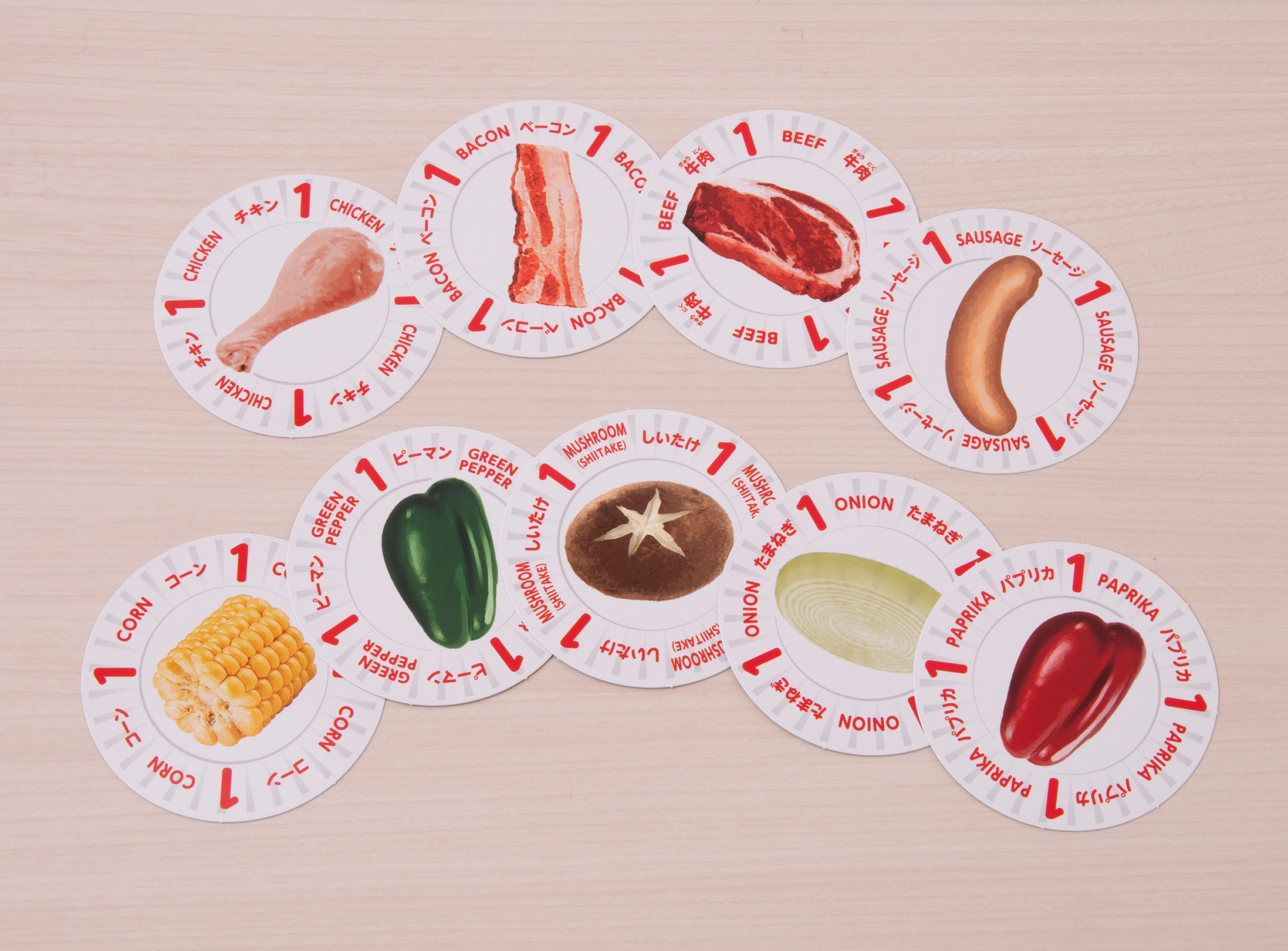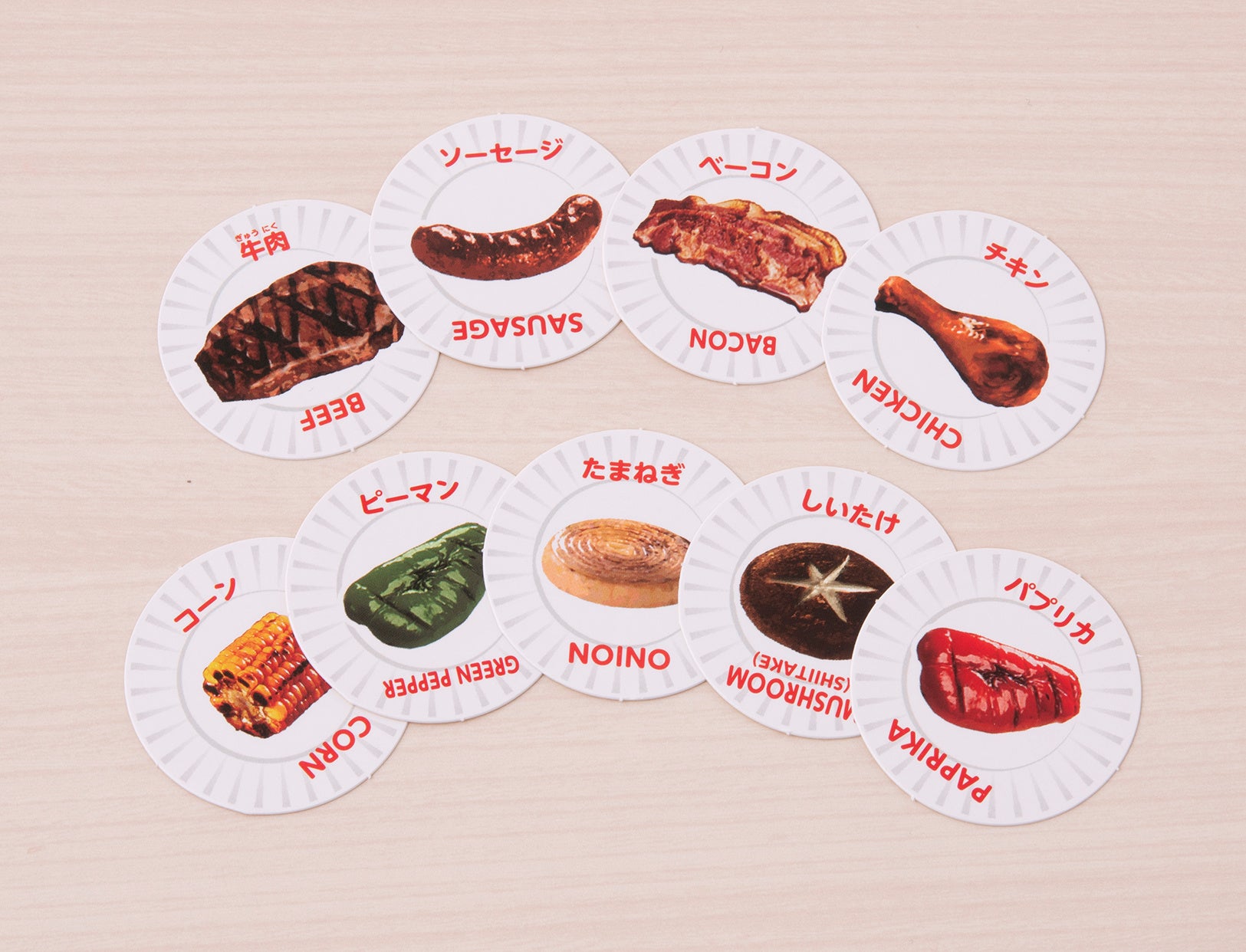 セット内容:●フォーク…4本(赤・青・緑・黄、各色1本)●生食材カード…72枚(大カード、全9種各8枚) ●焼き食材カード…27枚(小カード、全3種各3枚))●取扱説明書