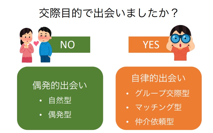 今までは同じコミュニティ内の相手と日々のコミュニケーションの蓄積によって親密な関係が育まれ交際につながり、結婚に至るケース(偶発的出会い)が多かったですが、現在は主に職縁結婚の衰退に伴い偶発的出会いが減少し、恋愛交際を望む人たちには自律的出会いが求められています。しかし、自律的出会いは偶発的出会いとそもそもの目的が異なることから、従来のようなコミュニケーションではうまくいかないケースも多いです。また、関係構築時には「相互の値踏み」が行われるなど「複数の相手と同時進行」でやり取りする人が多いことからマッチングが困難となり、偶発的出会いよりも個々のコミュニケーション能力が問われる傾向にあります。その結果、思うように交際・結婚にたどり着けず、結婚したいと考えている男女の非婚化へもつながっています。