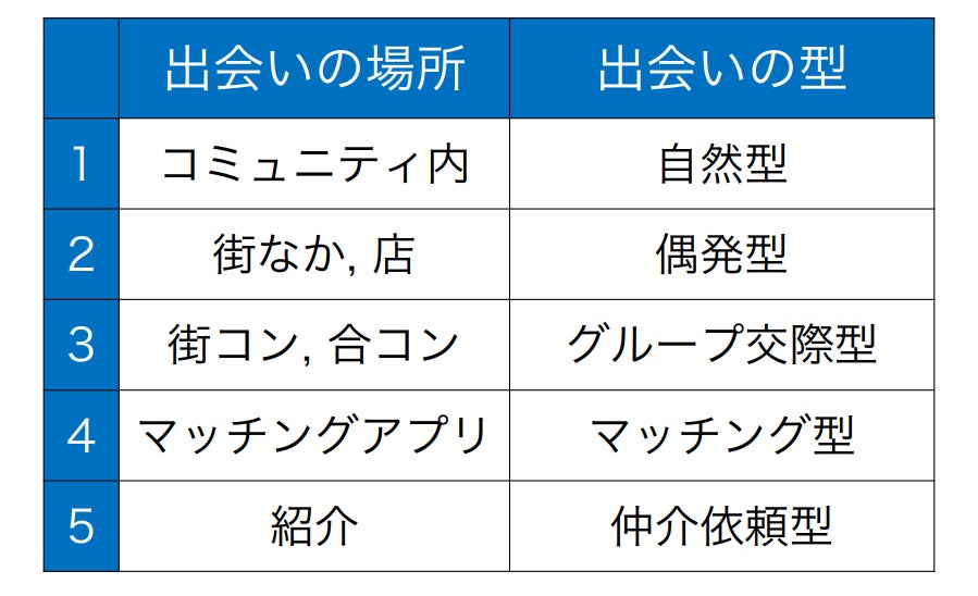 現在昔ながらのお見合い結婚や職縁結婚の衰退に伴い、自律的出会いの需要が高まり、出会いの場がさまざまな方向に広がっています。出会いの場を細かくわけたものが以下になります。