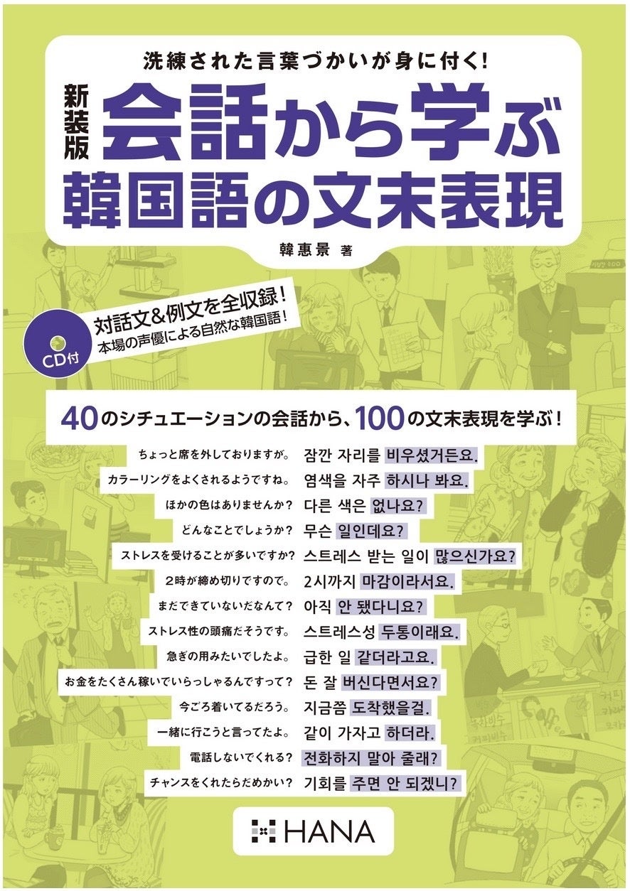「主人公の女性ナナとその家族、職場での日常会話を通してさまざまな文末表現の使い方と言葉遣いを学びます。本書の文末表現をマスターすることで、これまでとはひと味違った魅力のある素敵な韓国語の会話ができるようになるでしょう。」(韓国語のHANA公式サイト本書説明より)