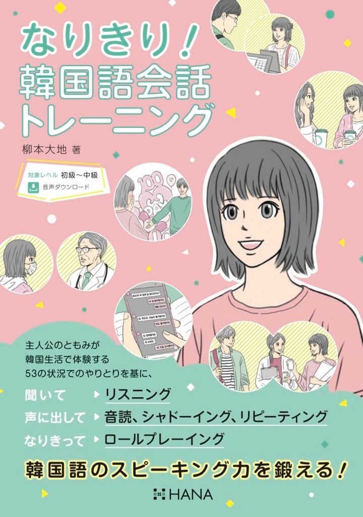 「本書では、初対面のあいさつにはじまり、寮生活、友達との会話、ショッピング、おいしいお店巡り、病院、コンサート、ソゲティン、ホームステイ、地方旅行、電話での通話、恋愛、アルバイトの面接や接客、コスメトーク、結婚式、キムジャン、正月体験、カード占い、ユンノリ、学校でのグループワークやフィールドワーク、プレゼンテーションまで、主人公のともみが韓国生活で体験する53の状況でのやりとりをもとに会話の練習をします。」(韓国語のHANA公式サイト本書説明より)