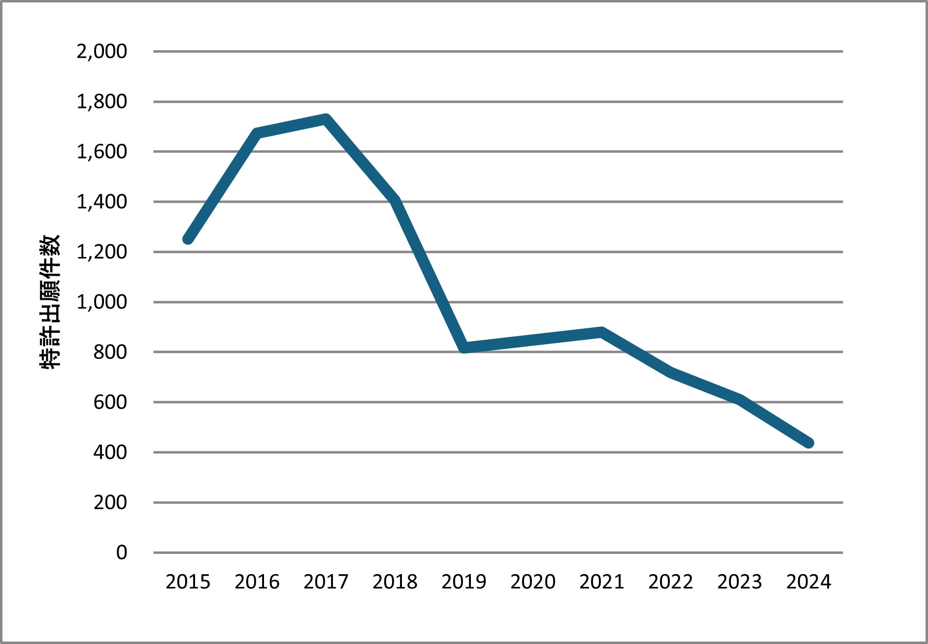 インセクトリファイナリーに関する特許の出願件数は、2015年から2017年まで急激に増加しましたが、その後は減少傾向にあります。この傾向は、イノベーションの停滞ではなく、技術の成熟と市場戦略の転換というポジティブな側面を反映していると考えられます。
