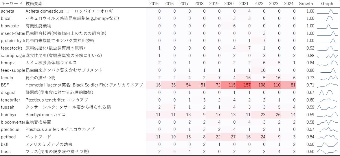 図1は、2015年以降出願のインセクトリファイナリーに関連する特許の要約にふくまれる特徴的なキーワードの年次推移です。成長率(growth)は2015年以降の文献中における出現回数と、2020年以降の文献中における出現回数の比で定義されます。1に近いほど直近に多く出現しており、近年注目されているキーワードであると見なせます。