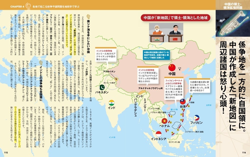 なぜロシアはウクライナに侵攻したのか︖、中国が台湾統一を望む理由、ミサイルを発射し続ける北朝鮮、次の成長国はどこ︖「グローバルサウス」の共通点とは︖、アメリカの中東離れのきっかけとなったシェール革命、米中半導体戦争の最前線に立つ台湾、中国の「新地図」に怒り心頭な周辺国…などなど、世界を揺るがす国際情勢や経済事情、紛争と諸問題のエポックのなかから地理的要因のあるテーマを選び、地図や図解を使って地政学的に紐解きました。
