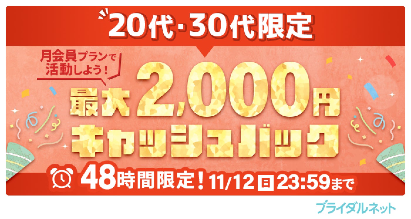 2023年も残すところあと50日ほど。年内の婚活を頑張りたい20代・30代の婚活世代を応援するため、ブライダルネットではアプリ限定キャッシュバックキャンペーンを48時間限定で実施!