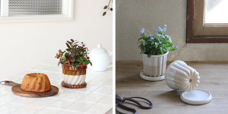 フランス伝統の焼菓子「カヌレ」と「クグロフ」の焼き型をモチーフにしたプランターは、底面や内側の独特なフォルムも再現し、ストーンウェアならではの温かみのある質感とチョコソースのような光沢のある釉薬がよりリアル感を醸し出しています。