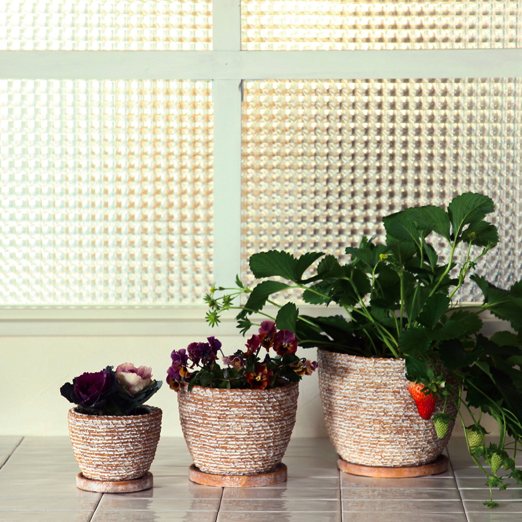 ローラーで柄付けをしたような彫のある北欧デザインを取り入れたプランター。少しゆがみのあるぽってりとしたフォルムが可愛らしく、素朴な風合いがインテリアのアクセントとなります。