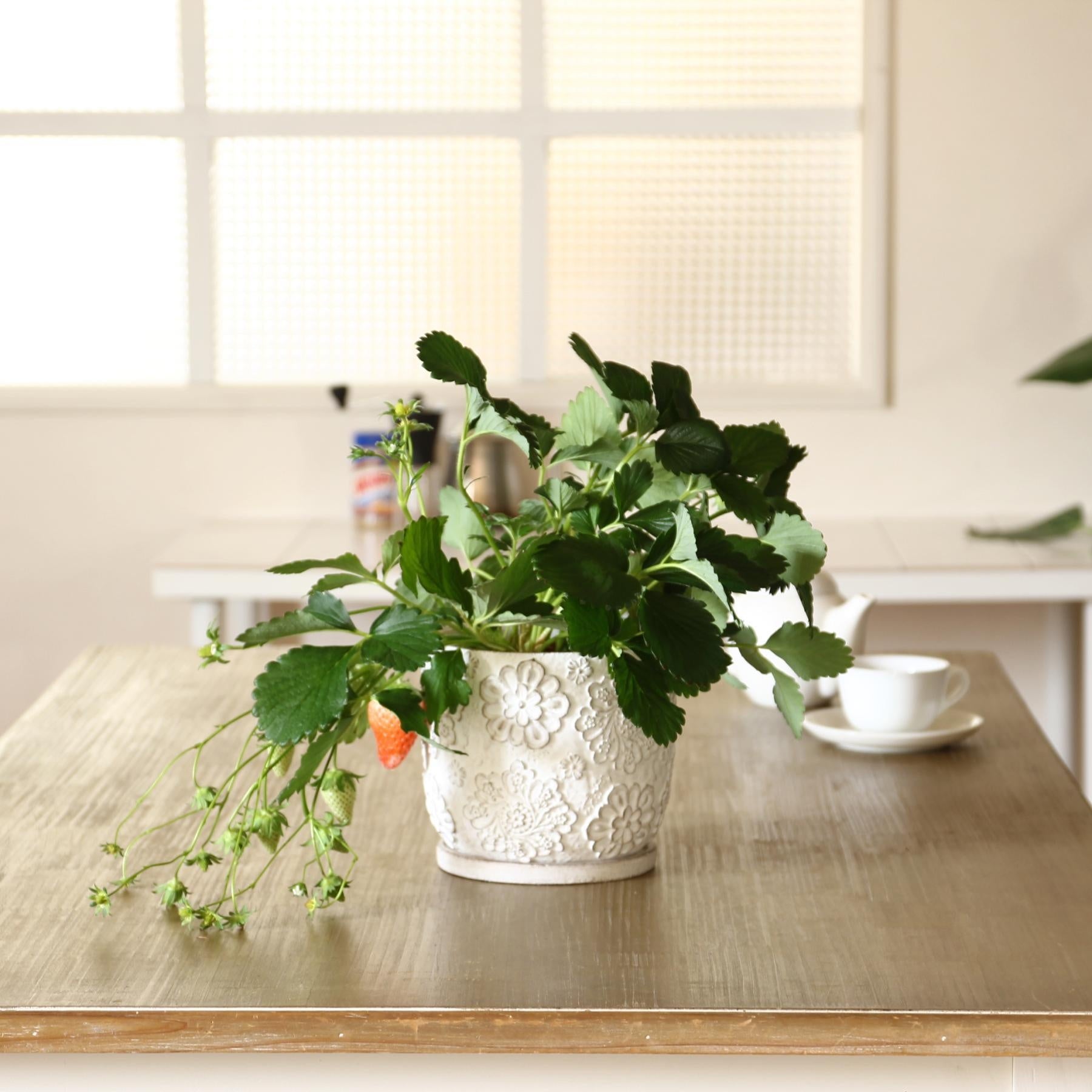 手彫りで彫ったような細かなデザインが施されたシンプルながら華やかなディティールが印象的なプランター。
