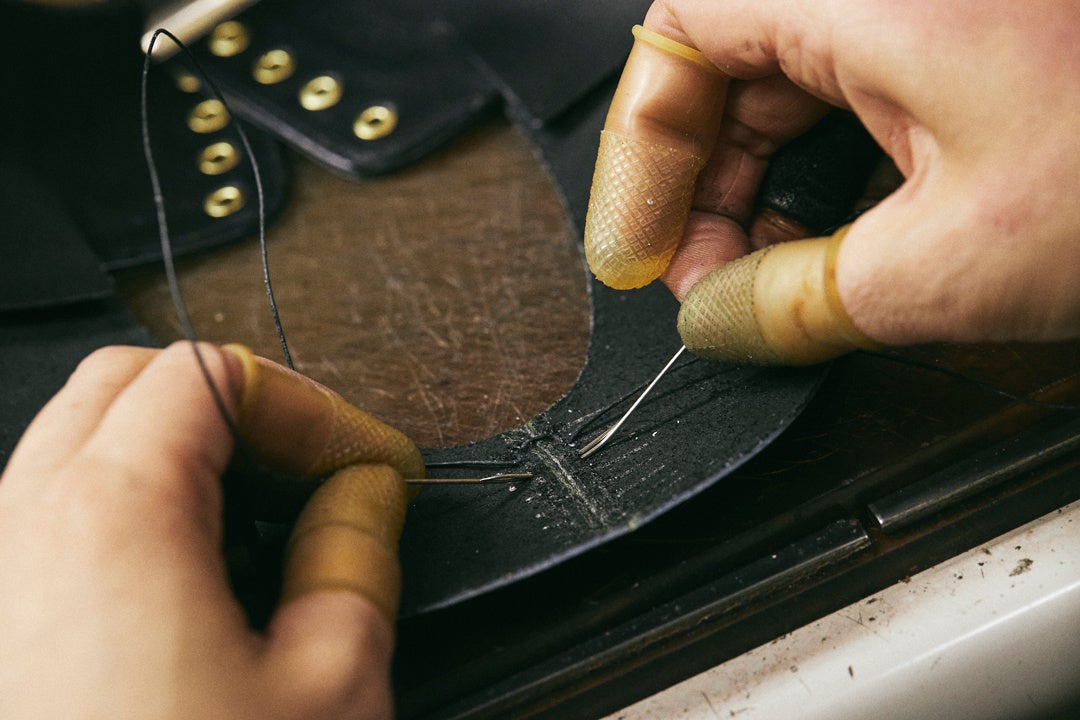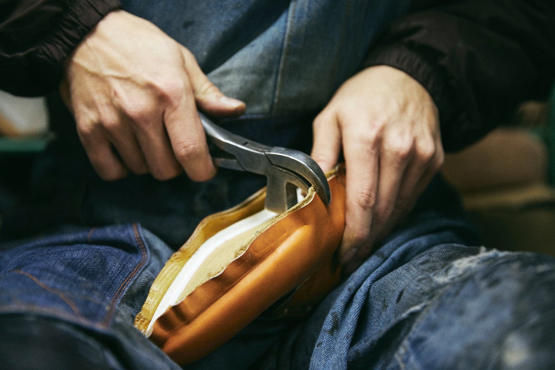※1)グッドイヤーウェルト製法:靴の中底にアッパーを吊り込み、ウェルトと呼ばれる帯状の革を巻きつけながら縫い付け、最後にウェルトとアウトソールを縫い付ける製法。