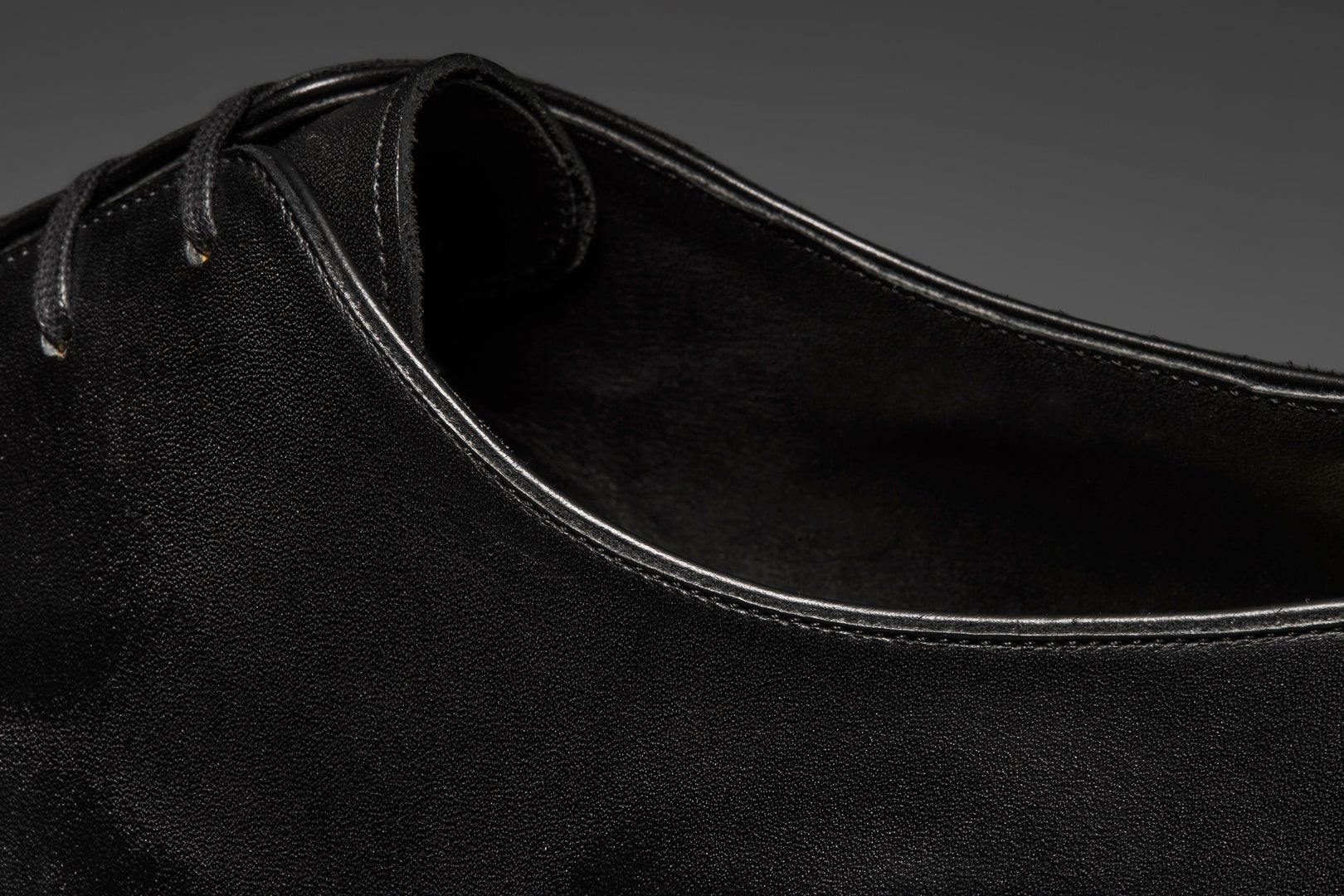 こうして完成するゼロシーム仕立て。一般的なホールカットに見られるヒール付近の継ぎ目がないため、流麗なフォルムがいっそう際立ちます。とはいえ、作り手の腕が悪かったり、各工程に充分な手間を費やさなかったりすると、シワや歪みが目立つ仕上がりになってしまいます。技術と美意識を兼備した職人がいてこそ、ゼロシームの流麗さは引き出されるのです。