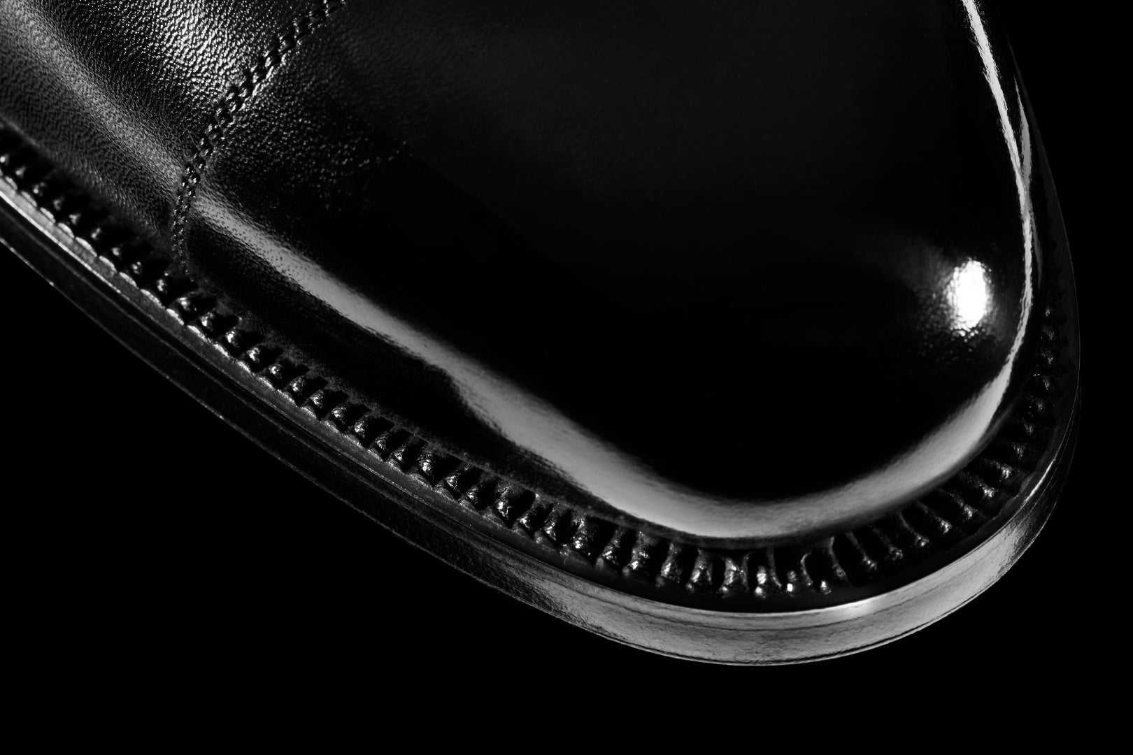 一見、ドレスシューズの大定番であるストレートチップのようで、特別な仕掛けがあります。実はこちら、ホールカットの「壱/ICHI」をベースにストレートチップ風のステッチをあしらった一足です。つまり、トウキャップのように見える一文字も、甲周りを切り替えているように見えるデザインも、すべて一枚革の上に“描かれた”もの。ゼロシームという特別な仕立てをあえてオーソドックスなストレートチップに落とし込むという、ある種非常に贅沢な遊び心を表現したモデルです。なお、「零」シリーズ共通の仕様として、出し縫い糸の上に刻まれた「目付け」と呼ばれる刻み模様は一本一本、手仕事で施されたもの。通常は凸凹のあるローラーを押し当てて一気に模様をつけますが、本シリーズは細部まで手間ひまかけて作り上げています。