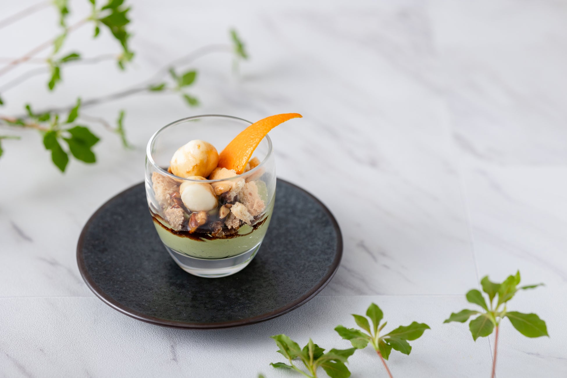 なめらかな口どけの抹茶プリンをベースにした、抹茶の香りや苦みを味わっていただけるグラスデザート。黒蜜の風味が抹茶を一層と引き立ててくれます。