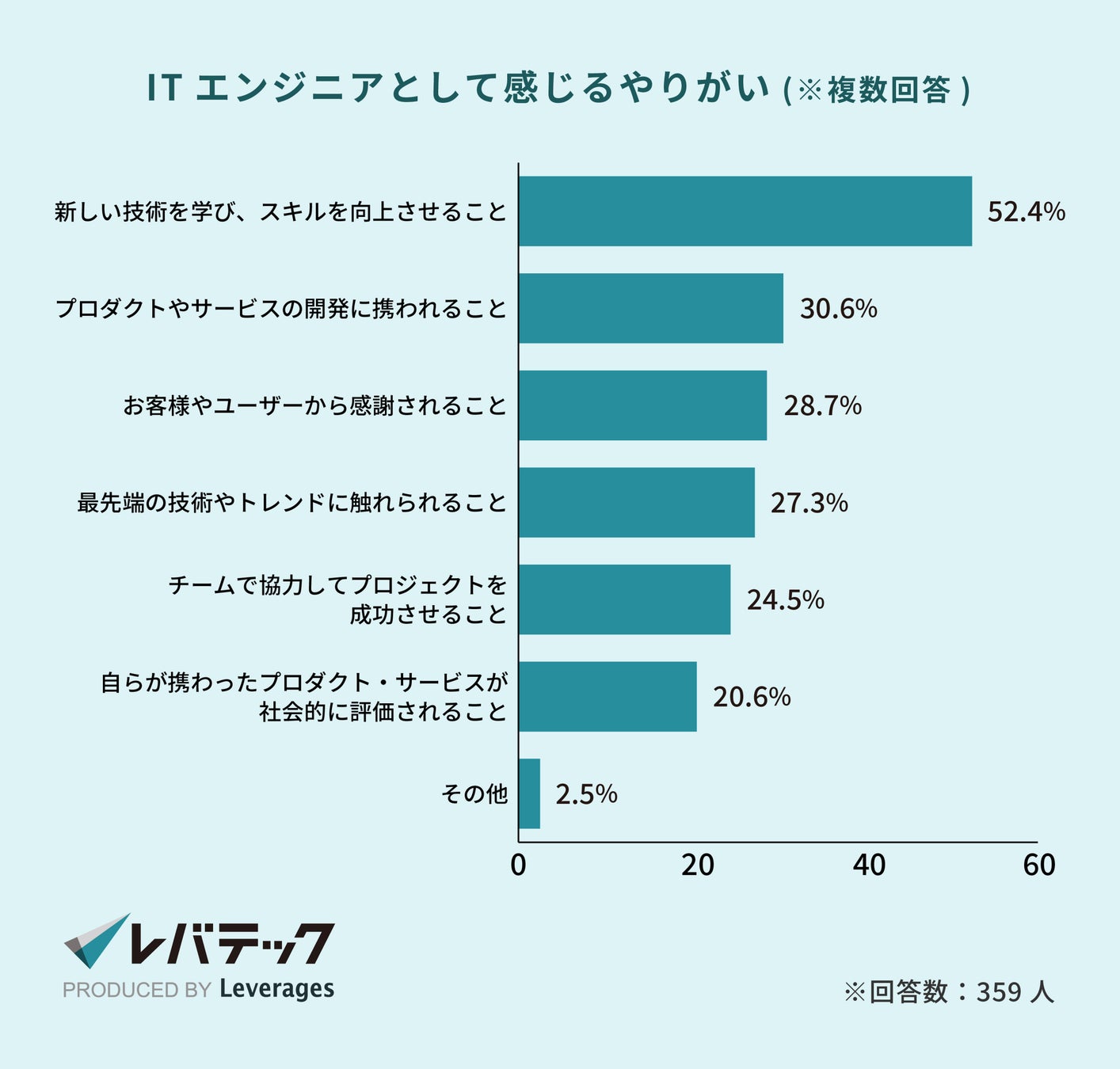 ITエンジニアのやりがいに関しても、半数以上が「新しい技術を学び、スキルを向上させること(52.4%)」と回答しており、新たな技術の習得やスキル向上が働く原動力に繋がっていることが分かりました。